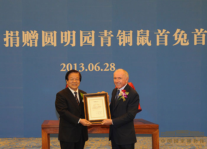 文化部部长蔡武向皮诺先生颁发了捐赠证书。文化部副部长、国家文物局局长励小捷在讲话中称赞皮诺先生的捐赠善举是对中国人民的友好表示和对中国文化遗产保护事业的热情支持,反映了国际社会对文物返还其原属国价值理念的认同,对促成更多流失海外中国文物的返还具有积极作用。表示国家文物局将继续与有关方面一起,不断努力促成更多非法流失出境的文物回归原属国。国家文物局已将两尊圆明园兽首划拨中国国家博物馆收藏。