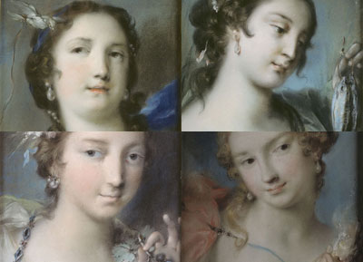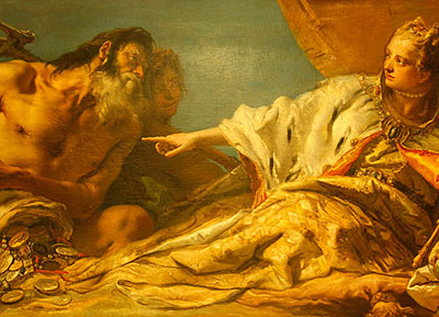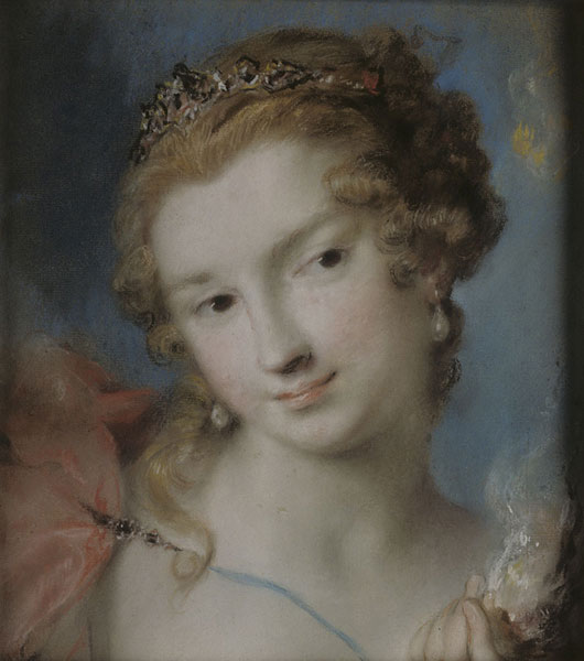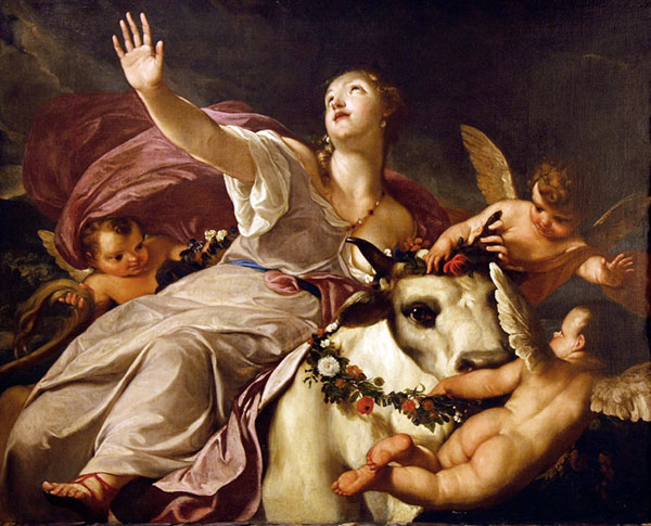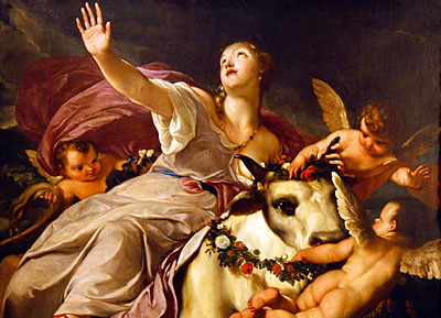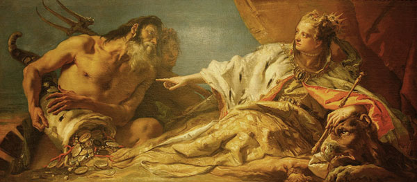 塞巴斯蒂亚诺·里奇,传承了巴洛克末期“浅色调画家”的遗产,在威尼斯开启了所谓十八世纪洛可可绘画的时代,其主要特点是轻盈、明亮、色彩鲜艳。这是威尼斯绘画史上一个特殊时刻,她重新获得欧洲的认可和荣誉,画家们受到全世界的邀约,几乎所有的画家忙着穿梭于威尼斯、欧洲宫廷和各国首都之间以完成委托。尤其大获成功的是那些善于为建筑绘制装饰画的画家,詹巴蒂斯塔·提埃坡罗无疑是此中翘楚!尽管“威尼斯风格”已成为金字招牌,巨大的国际声誉往往与近代收藏的崛起密切相关,独具特色并擅长某一类型的作者尤其受到青睐。罗萨尔巴·卡列拉便是如此,她精通粉彩肖像,受到德国和巴黎宫廷的喜爱。在威尼斯,詹巴蒂斯塔·皮亚泽塔的绘画受到高度评价,他的特点在于将阳光作为主导性光源,其投射在画面的方式令色彩与阴影的深度产生特殊的对比关系。他创建的年轻艺术家培训学院传授这种处理方法,被很多出色的学生沿用,比如安东尼奥·马里内蒂。当然,十八世纪绘画的头把交椅无疑属于詹巴蒂斯塔·提埃坡罗,不仅是在威尼斯,更是在整个欧洲。这位性格古怪、多才多艺的天才,有着匪夷所思的构图。他使用的清透色彩十分迷人,光线强烈,甚至令人眩目;他沿袭了十六世纪的委罗内塞学派,并将其发挥到极致的精湛,描绘出奇迹般的惊人场景——人类,神,寓言和幻想中的生物,尤其是那晴朗的天空中几丝柔美的云,提埃坡罗因此大获成功。他的作品充满幻想,令人神往。