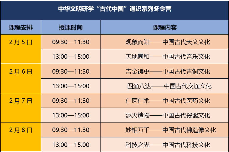 “古代中国”通识系列课程趣味十足!它以“主题式探秘”为主打特色,紧密结合中小学生知识结构,课程围绕科技发明、艺术之美、非遗传承、乐舞服饰等方面展开,本期特别为孩子们挑选了中国古代天文、音乐、青铜等八门课程。你是否好奇古代瓷器为何这般精美?编钟敲响时究竟有多悦耳?古人出行方式是怎样的?青铜器又隐匿着哪些秘密?这八大主题课程将为你逐一揭开谜团!此系列课程尤为适合那些对中国古代历史文化满怀好奇,却不知如何开启探索之旅的小伙伴~