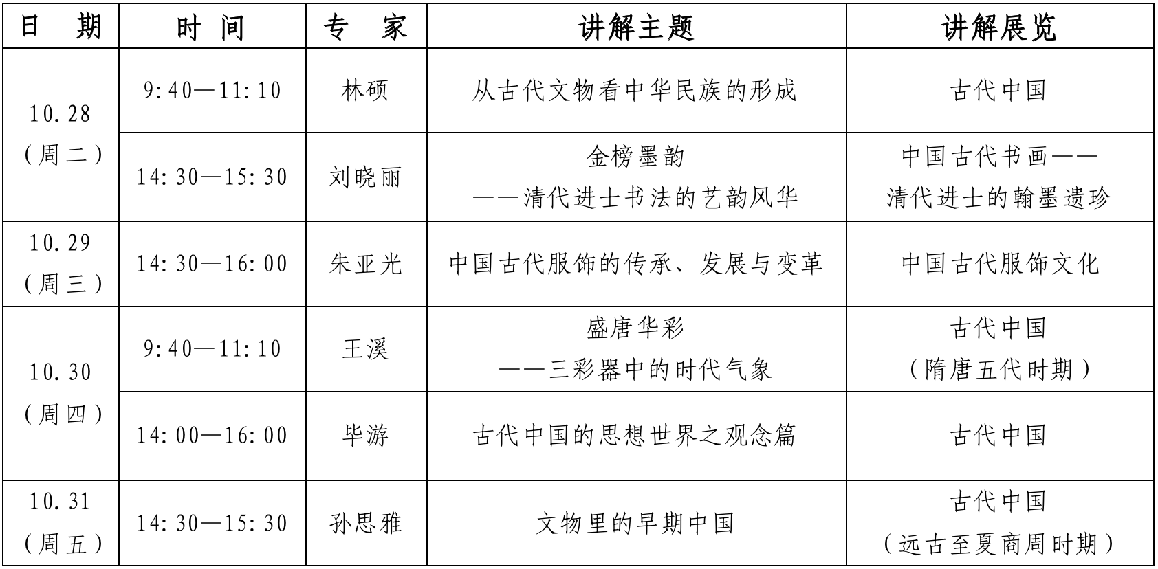 中国国家博物馆“专家讲解周”将在十月推出6场专家讲解。本期专家讲解主要围绕“古代中国”基本陈列,以及中国古代服饰文化、中国古代书画等展览开展,通过专题导赏,带您从不同视角看展览、赏文物、观古今,感受文化的永恒魅力。