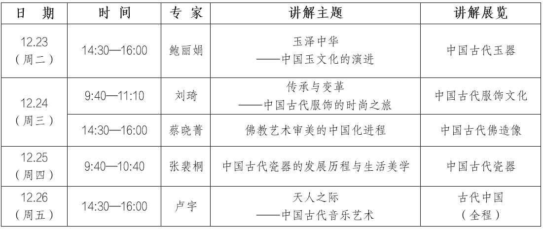 中国国家博物馆“专家讲解周”将在十二月推出5场专家讲解。本期专家讲解将围绕“古代中国”“中国古代瓷器”“中国古代玉器”“中国古代服饰文化”“中国古代佛造像”等展览,通过专题导赏,带您从不同视角看展览、赏文物、观古今,感受文化的永恒魅力。