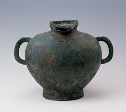 铜扁壶与银盆、银鋗、铜鉴等沐浴用器同出,当属沐浴器具,是沐浴时用来舀水或往身上浇水用的。扁壶始现于春秋时期,为汉代较为常见的器物,质地有漆木器,也有铜器。铜扁壶有蒜头形的,也有圆直口带盖的,还有带提梁的。有学者认为扁壶在中原地区的出现可能与北方游牧文化的传播有密切关系。这件铜扁壶造型独特,与常见扁壶区别较大,很可能是楚国工匠吸收草原游牧文化因素设计制作的。这种扁壶也是楚国王室用器中比较有特色的器物。