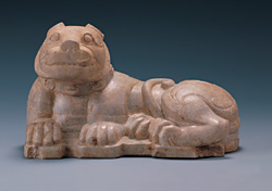 石豹镇采用圆雕技法雕琢而成。豹体肥硕,长尾从两后腿间反卷曲于背上,四足巧妙地分布在同一侧,少了野性,但显得雄健而又温驯。镇用于压席子四角,避免由于起身落座时折卷席角。汉代流行在室内铺席子,镇的使用也更加普遍,质地和形制丰富多彩。制作镇的材料有玉、石、铜、铁、琥珀等,有的镇体上还错金银。造型有人物、虎、豹、辟邪、羊、鹿、熊、龟、蛇等形式。在未经盗扰的汉墓中,压席的镇为四枚,多排列成方形。汉代流行以豹、虎等较凶猛的动物为形象的席镇,含有辟恶避邪的用意。 |