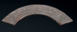该玉璜是狮子山楚王墓出土的玉璜中最精美的一件,玉质为新疆和田白玉。璜体两面纹饰相同,每面以穿孔为中心,中间为一兽面纹,两侧各雕一龙,龙首一侧为凤喙,龙身旁布满凤羽。龙身外各雕四条相互虬曲蟠绕之龙。整件玉璜全部采用浅浮雕,两面共雕饰20条龙、4只凤鸟和2个兽面,给人以龙凤呈祥、龙腾万里之感,构图奇妙,工艺精湛。玉璜在新石器时代就已出现,西周时期成为高级贵族复杂的组玉佩中的重要组成部分,多数玉璜两端有两个系穿用的孔,玉璜在组玉佩中多是水平佩戴,拱部朝下。春秋以后,多数玉璜在璜体中部拱顶处只钻一个孔,佩戴时璜拱部朝上,与早期正好相反。