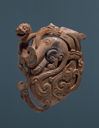 该玉佩用透闪石制成,由于受沁呈鸡骨白,上有黄白色包浆。玉佩正面透雕蟠绕三螭,左上部螭首张口瞠目伸出体外。玉佩上部正中雕一双面螭首,螭口即为佩挂时穿系之孔。背面亦雕有蟠绕虬曲的两螭,整体造型生动,刻镂精细。重仅18克。