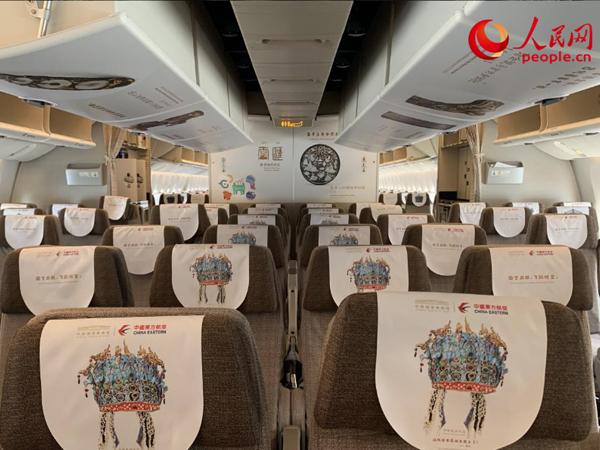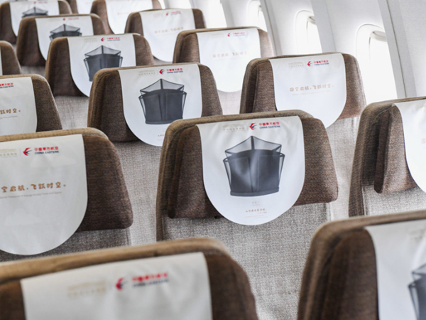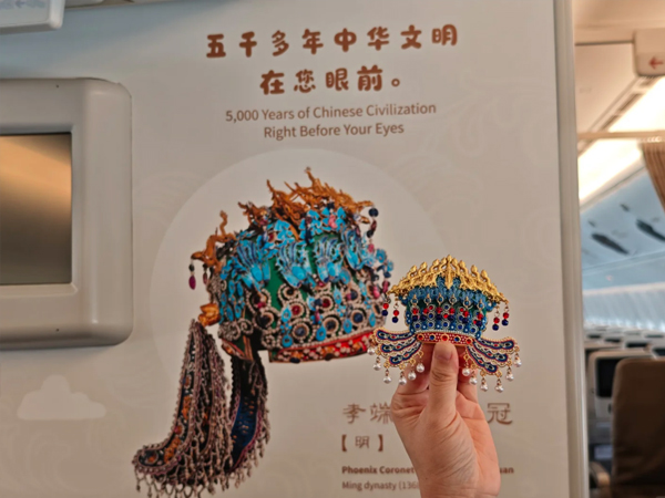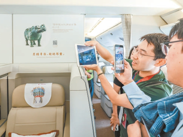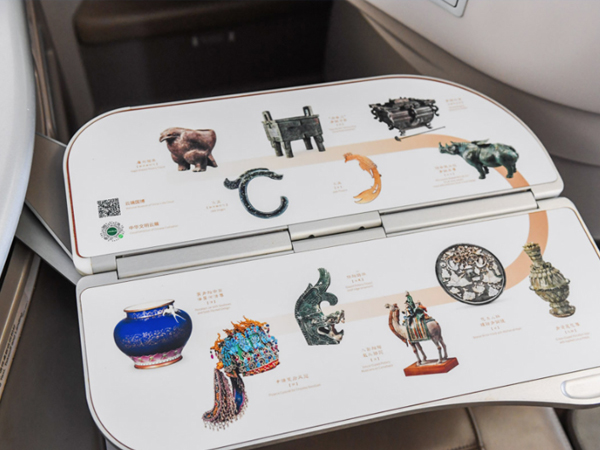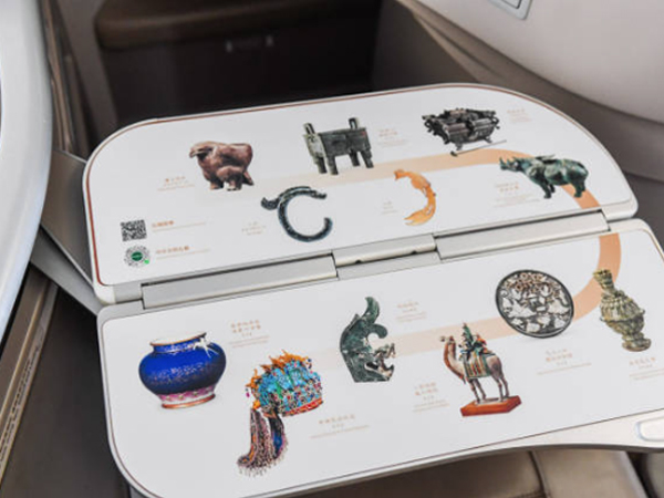 不用担心稍远的文物看不见。我们把小桌板和头枕巾设计成了知识卡片和互动体验装置。扫一扫小桌板上云端国博,即可了解“国博号”里的所有文物,欣赏国博正在展出的展览。