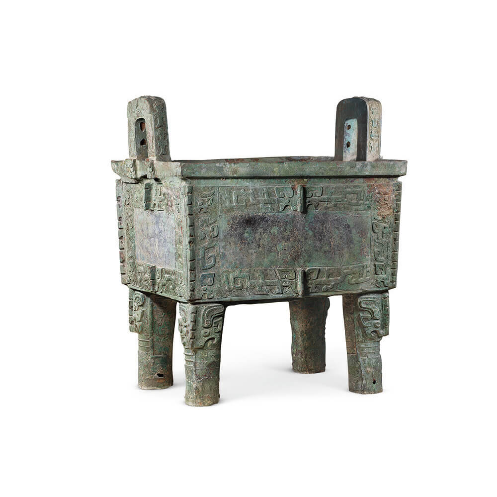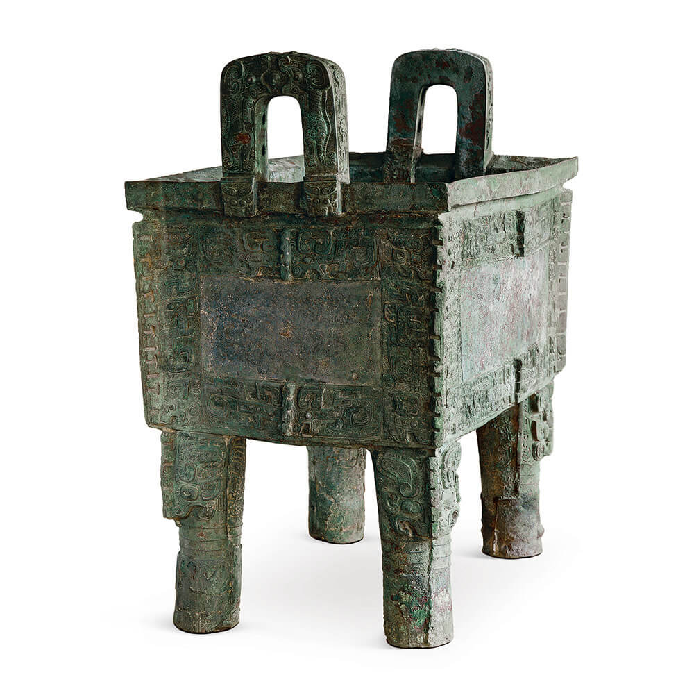 四羊青铜方尊,在现存商代青铜方尊之中体型最大。器造型雄奇,肩部、腹部与足部作为一体,被巧妙地设计成四只卷角羊,各据一隅,庄静中突出动感,匠心独运。整器花纹精丽,线条光洁刚劲。通体以细密云雷纹为地,颈部饰由夔龙纹组成的蕉叶纹与带状饕餮纹,肩上饰四条高浮雕式盘龙,羊前身饰长冠鸟纹,圈足饰夔龙纹。方尊边角及各面中心线,均置耸起的扉棱,既用以掩盖合范痕迹,又改善器物边角的单调,增强了造型气势,浑然一体。