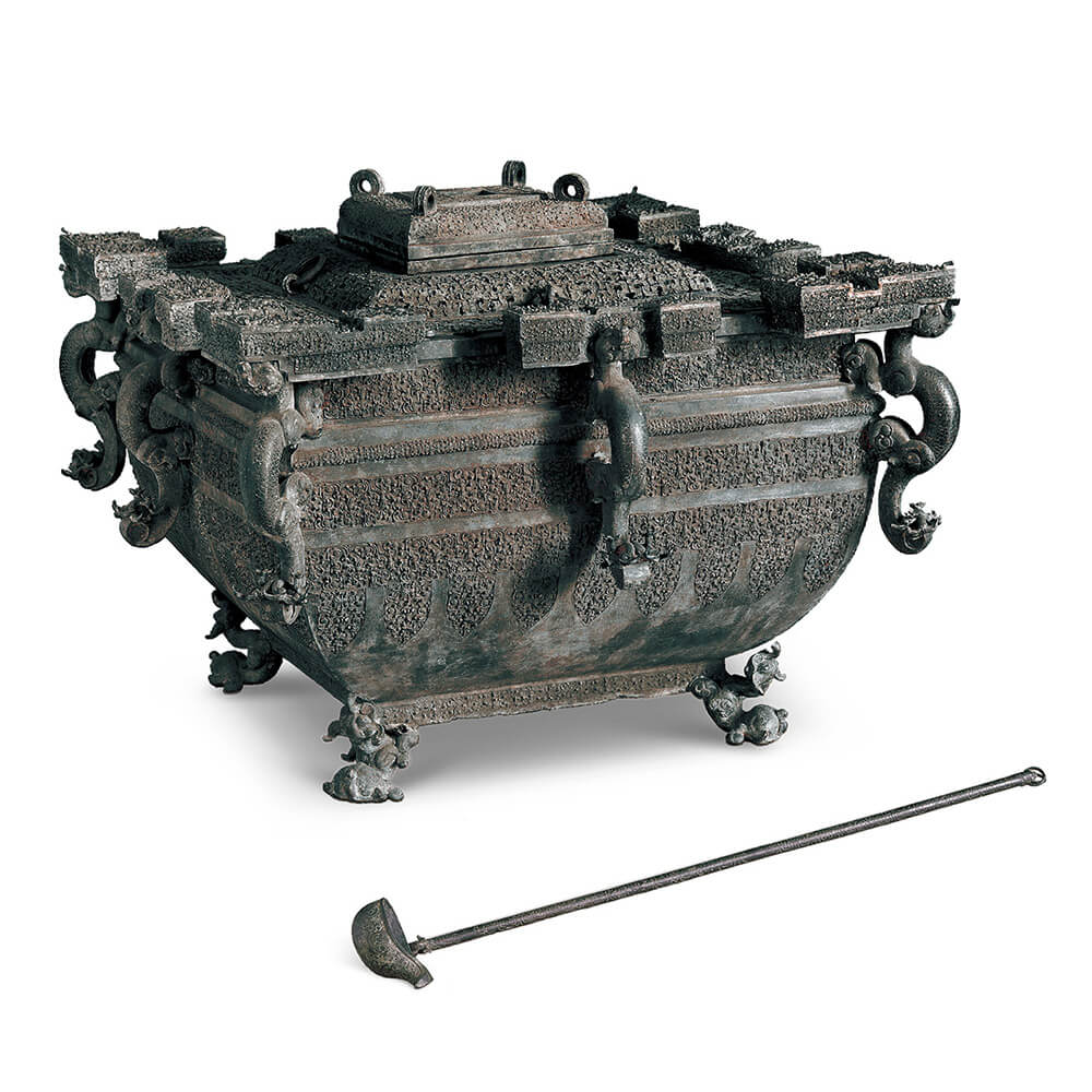 这件青铜冰鉴是由一个方鉴和一件方尊缶组成的青铜套器,方尊缶置于方鉴内,其底部一侧有两个长方形榫眼,另一侧有一个长方形榫眼,安装时,把这三个榫眼与方鉴内底的三个弯钩扣合,其中一个弯钩的活动倒钩自动倒下后,可把方壶固定在方鉴里而不晃动,制作十分巧妙。与青铜冰鉴配套的还有一把长柄青铜勺,勺的长度足以探到尊缶内底。该鉴外表华丽、体态厚重、结构精巧、工艺精美,令人惊叹不已。