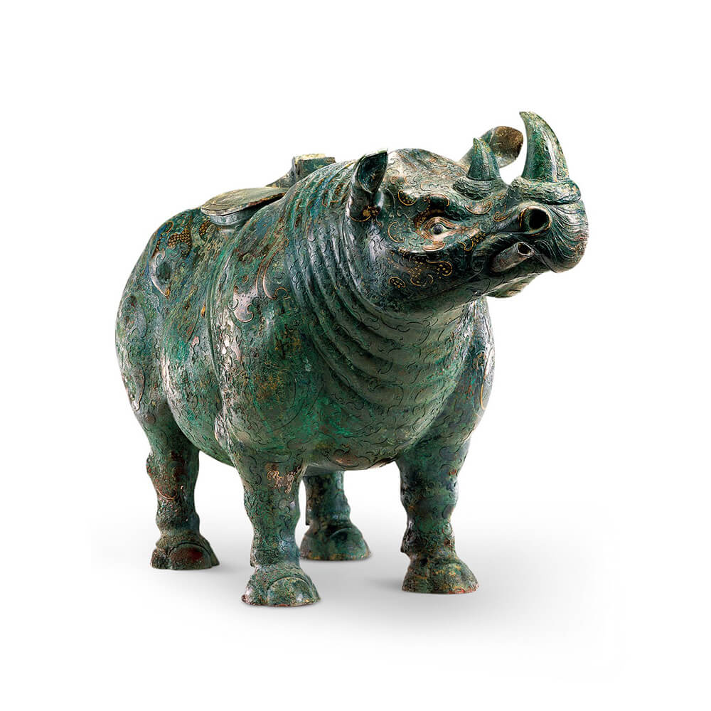 此犀牛是古代生活在中国的苏门犀的形象。在古代,中国不仅产犀牛,而且数量很多。在制造铜犀尊时,古代工匠创造性地采用了春秋战国时期大发展大流行的错金银工艺,为器物注入了生机勃勃的趣味和自由的气息。