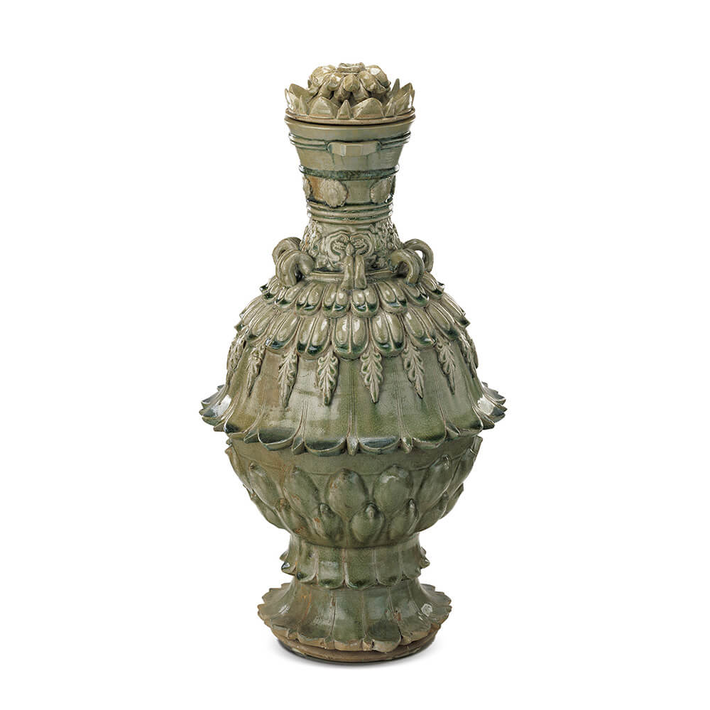 这件青瓷莲花尊侈口、长颈、圆腹,高圈足。器身上下遍布纹饰,颈下部两侧各有2尊交脚并坐的佛像,佛像有背光,两侧有莲花纹。两侧佛像上方各有一个飞天,飞天两侧有云纹、莲花纹。肩部有复式双系耳6个。腹部饰凸雕莲花4层,上3层为覆莲,下一层为仰莲。覆莲每层由一周15 个莲瓣组成。第2层莲瓣中间夹饰下垂的菩提叶纹。第3层莲瓣最大,莲尖突出最长,在莲瓣中间夹饰小莲瓣,第4层仰莲由13个印贴的莲瓣组成。足部饰2层莲瓣纹,每层11个。