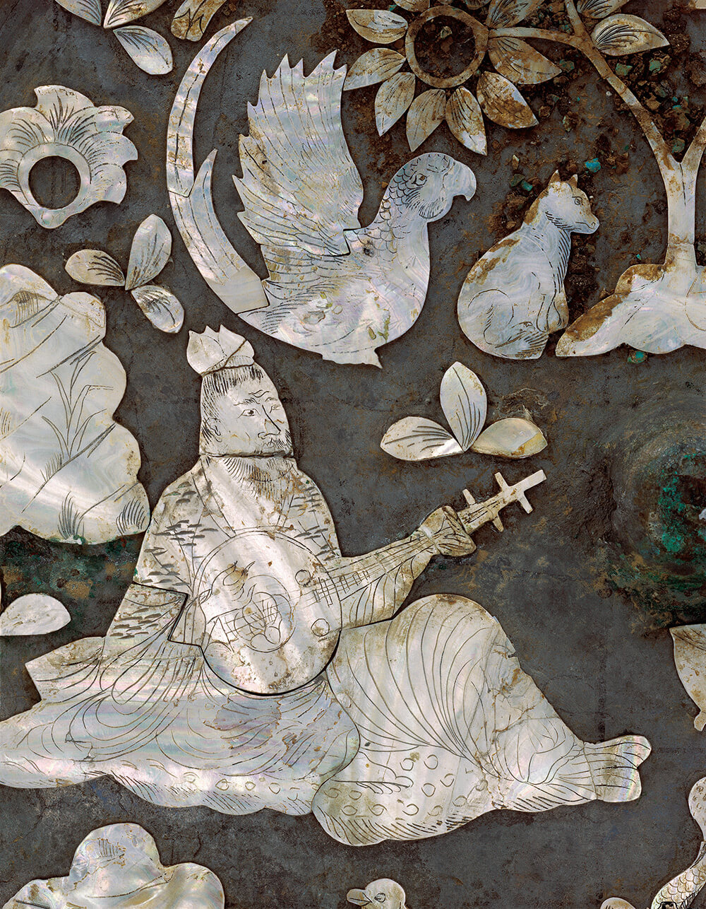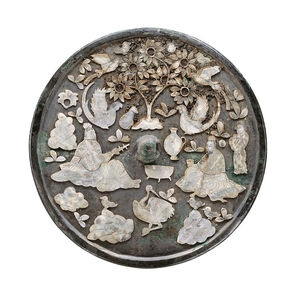 青铜镜圆形,圆钮,纹饰华美,以螺钿镶嵌而成,螺片光泽莹润。镜钮上方正中位置是一棵花树,右边树梢上悬一轮明月。钮两侧各有一位身着宽袍大袖的男子坐于树下,他们伴着清风明月、落英缤纷、禽鸟啾啾,一人弹阮,一人把酒欣赏。执杯人面前有一盆一壶,身后立有侍女。在钮的下方,山石、水池错落,并有禽鸟起舞。螺钿人物的衣饰、禽鸟的羽翼刻画细致清晰。钮上所嵌螺钿已失。