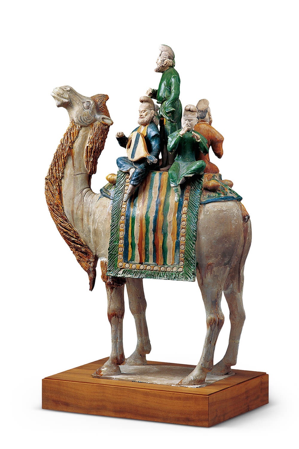 骆驼昂首挺立,驮载了5个汉、胡成年男子。中间一个胡人在跳舞,其余4人围坐演奏。他们手中的乐器仅残留下一把琵琶,据夏鼐先生研究,应该是一人拨奏琵琶,一人吹筚篥,二人击鼓,均属胡乐。骆驼载乐陶俑巧妙地夸张了人与驼的比例,造型优美生动,釉色鲜明润泽,代表了唐三彩的最高水平。