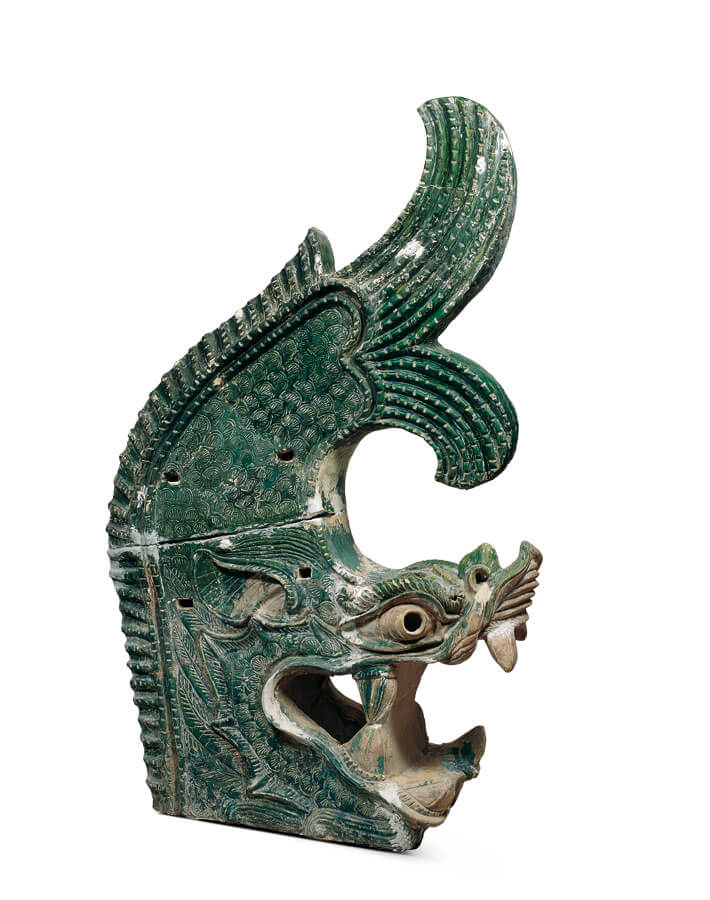 此物为建筑构件,形体高大,呈龙首鱼身状,龙首与鱼身系分别烧制成型,通体饰鳞纹,施绿釉,釉面光亮,威猛生动。