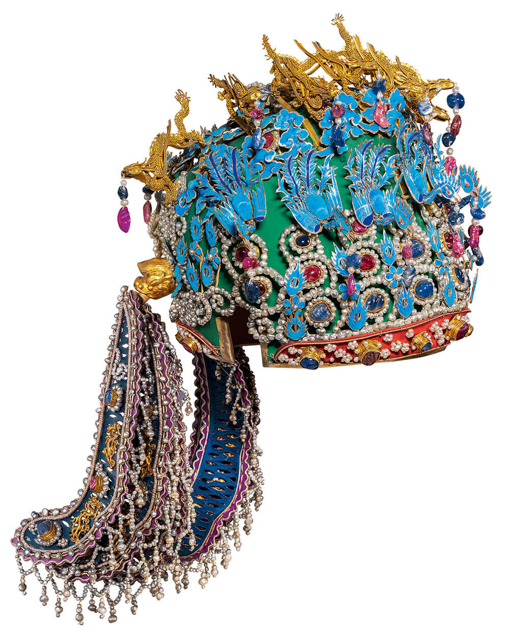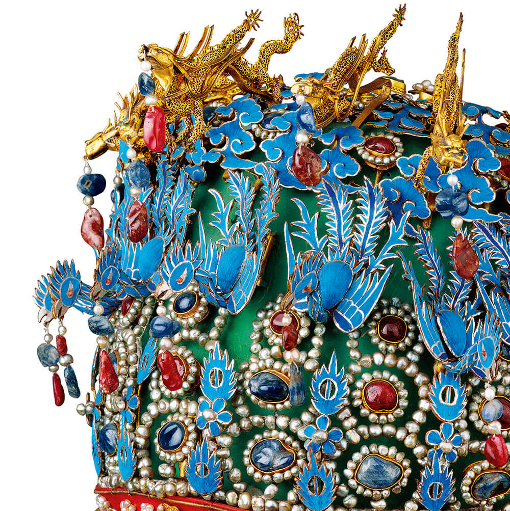 这件9龙9凤冠,主人为万历孝端皇后。凤冠用漆竹扎成帽胎,面料以丝帛制成,前部饰有9条金龙,口衔珠滴,下有8只点翠金凤,后部也有1只金凤。后侧下部左右各饰点翠地嵌金龙珠滴三博鬓。此冠共嵌未经加工的天然红宝石100余粒,珍珠5000余颗。