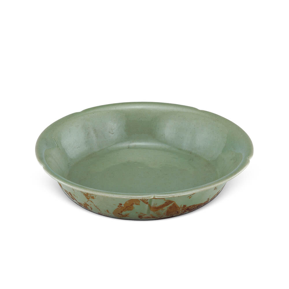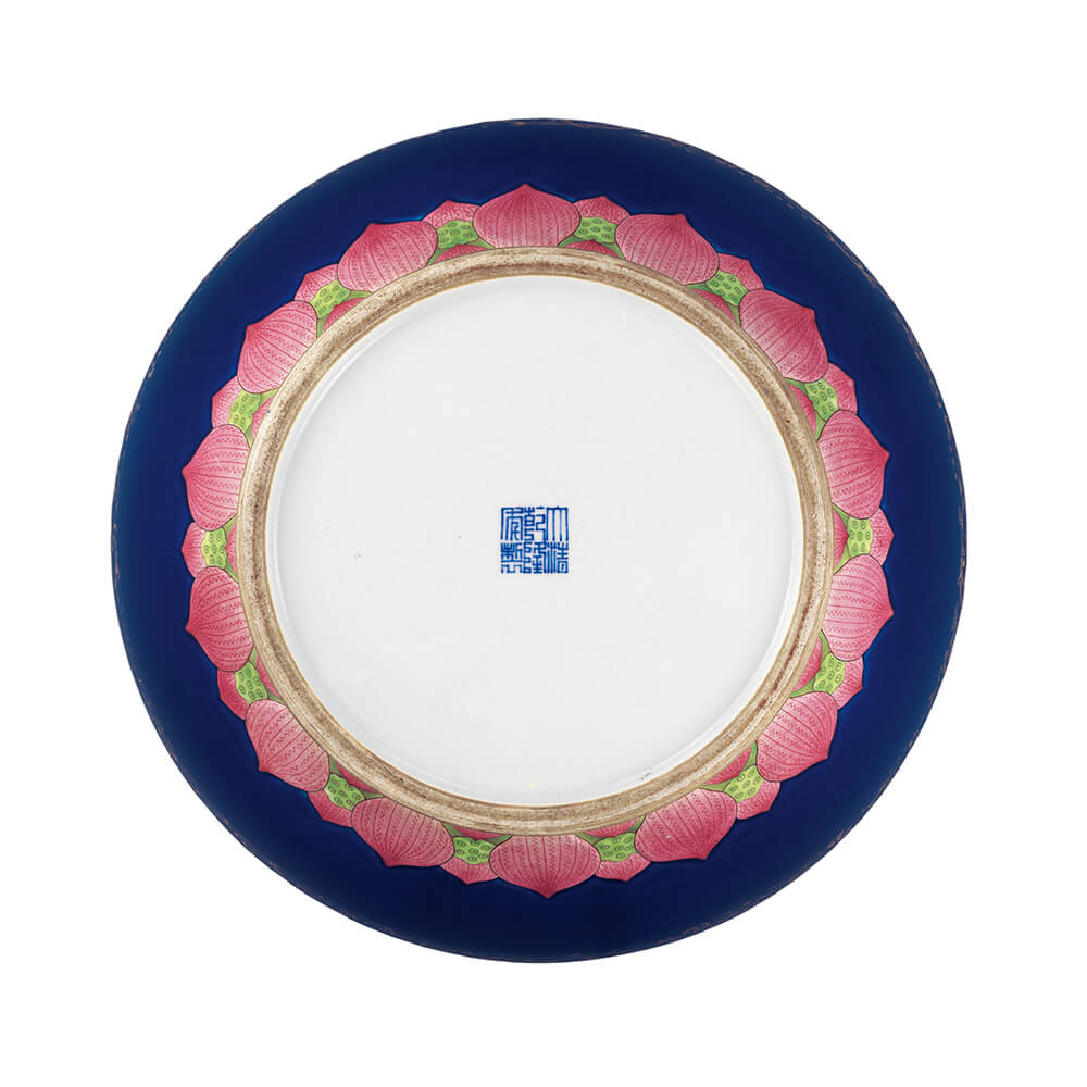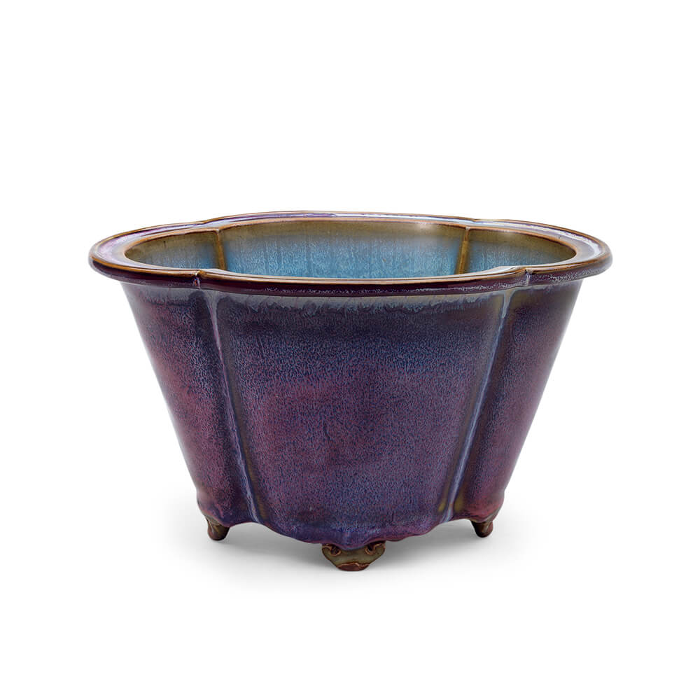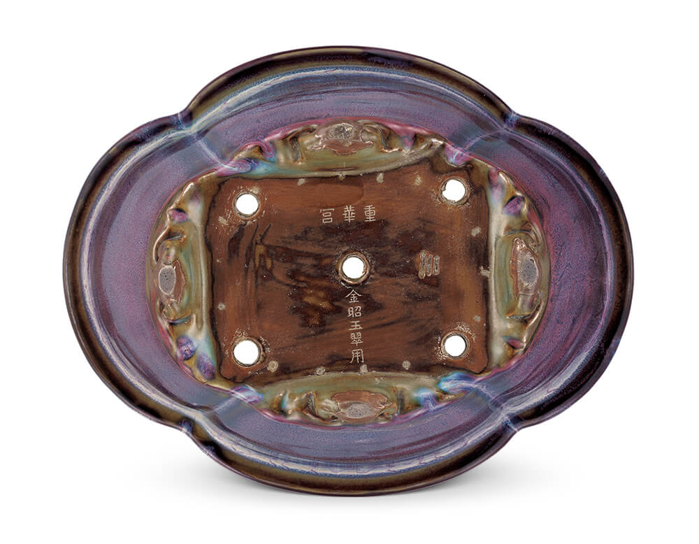 此花盆口呈海棠式,晶莹的天蓝釉色中映现出宛若玫瑰般的紫红,极其斑斓。外底刻“重华宫”、“金昭玉翠用”等楷书题字,为清宫旧藏。