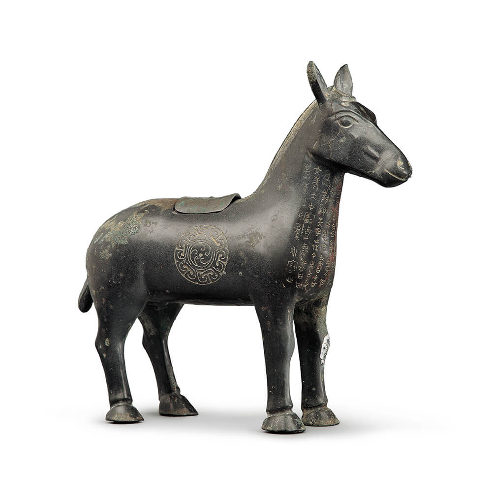 整器为一骡驹,昂首站立,竖耳垂尾,颈后鬃毛齐整,生动传神。器盖开于驹背。驹腹两侧饰涡纹,周缘环饰穷曲纹。驹颈、胸部及器盖内铸铭文105字,记述甲申日周王“执驹”,并赏赐 两匹驹。此驹尊正是 为纪其事而作。