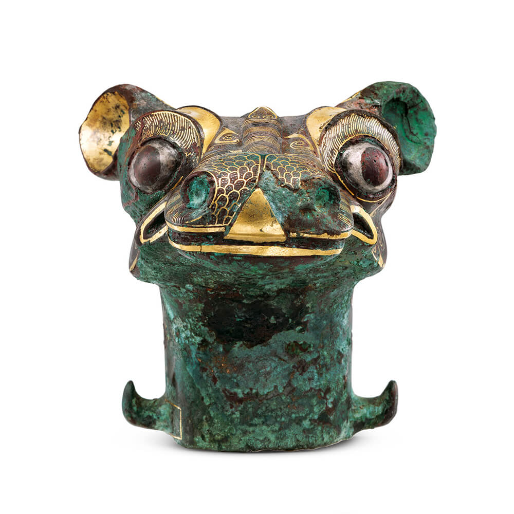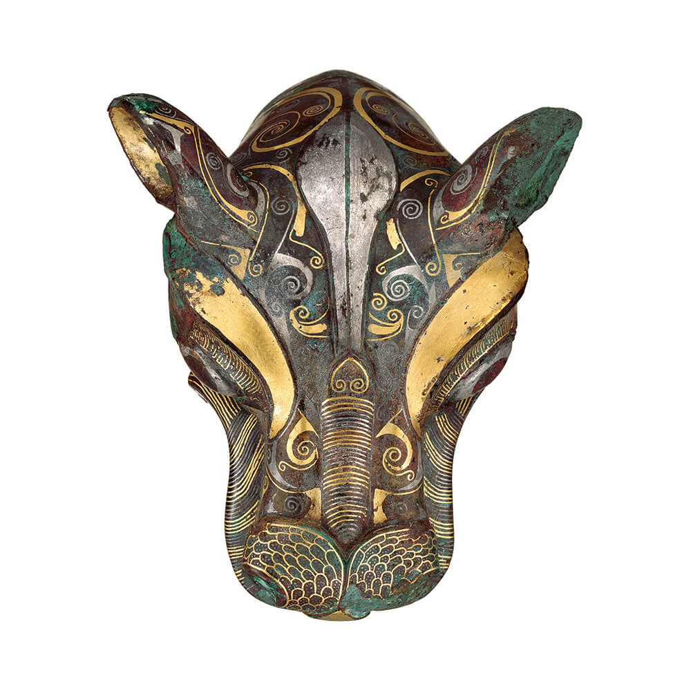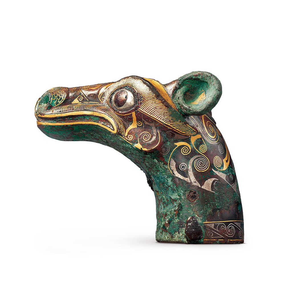 这件青铜䡇呈马首形,其头部和颈部用错金银的工艺装饰云纹和鳞纹。是车用装饰,装配在车辕的前端。