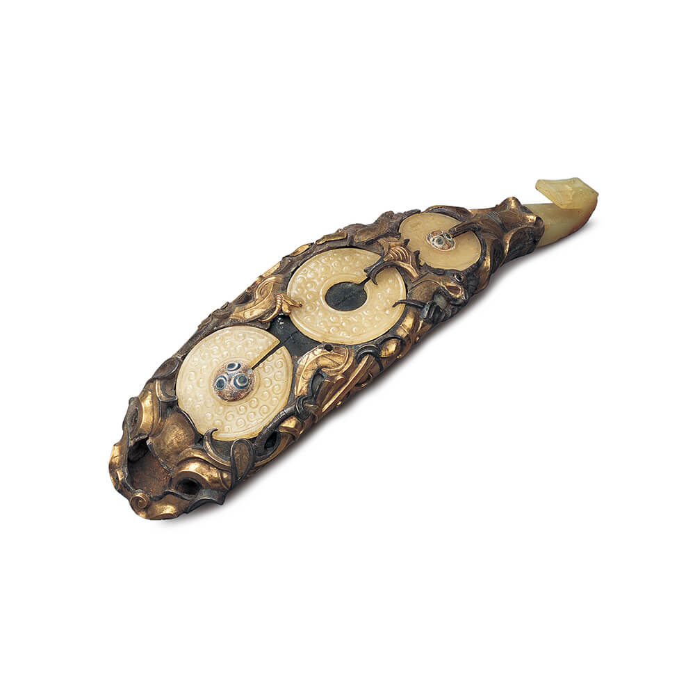 这件带钩银质鎏金,钩两端铸成浮雕式的兽首,钩两侧为长尾鸟。钩身正面嵌饰3块白玉玦,两端玉玦中心各嵌一粒半球形蜻蜓眼琉璃珠(中间玉玦之琉璃珠可能脱落 )。钩头用白玉琢成雁首形。整个带钩把金属铸造工艺和琢玉工艺结合起来,堪称中国古代最华美的带钩。