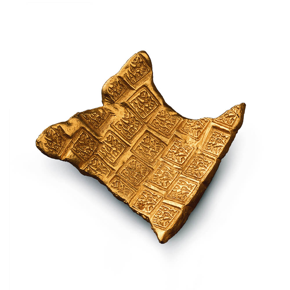 这是一种纯黄金的长方形版状货币,上用印凿打钤印文“郢爯”。“郢”是地名,是战国时期楚国的都城,在今湖北江陵附近。“爯”是称量的意思,表示此货币在使用时被切割成小块称量计算。郢爯是中国最早的黄金铸币之一。