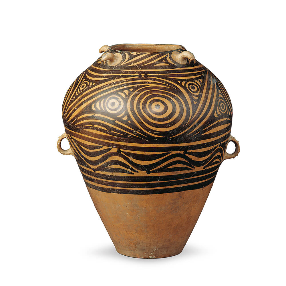 此彩陶罐呈敛口鼓腹的瓮状。口沿外侧有四个钩状泥突形成四系,腹部两侧有对称的环状耳。器表饰黑彩,上腹部有旋涡纹绕器一周,在 2 个大旋涡纹之间各再绘出 2 个小旋涡纹,旋涡纹带以下有一周水波纹带和弦纹带加以承托。整个画面既像水面被雨滴击起的层层涟漪,又仿佛是湍急的河水激流涌动而形成的一个个大小旋涡。此陶罐以其纹饰精美成为马家窑文化的代表作,被誉为“彩陶之王”。