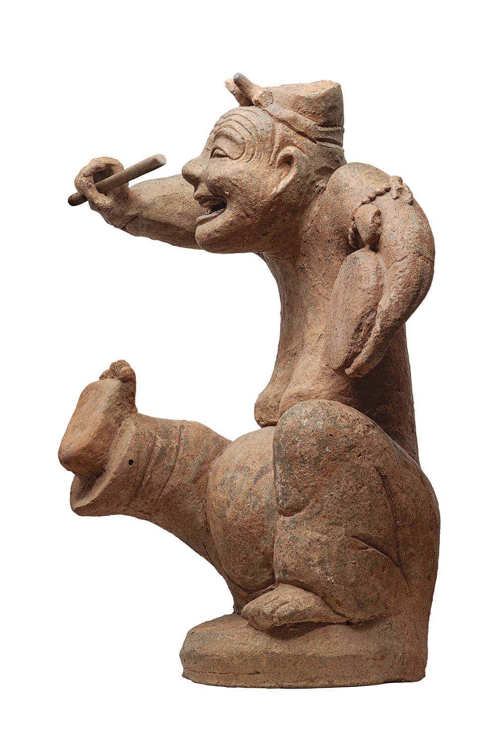 此俑头上戴帻,额前有花饰,袒胸露腹,两肩高耸,着裤赤足,左臂环抱一扁鼓,右手举槌欲击,张口嬉笑,神态诙谐,动作夸张,活现一俳优正在说唱的形象。