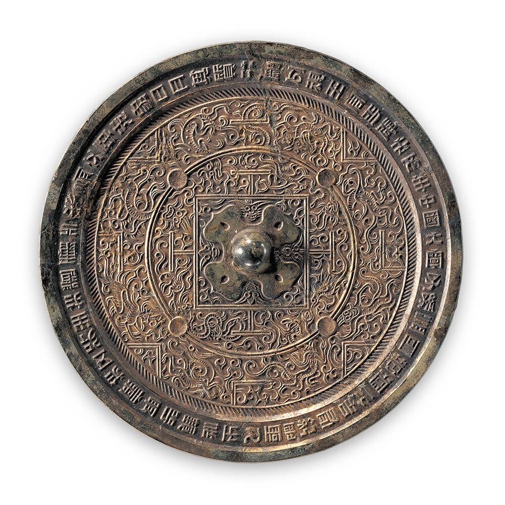 此镜表面鎏金。圆形,圆钮,四叶纹钮座,间饰兽首纹。外围双线方框。镜背纹饰由一周双线弦纹分为内外两区,弦纹上分布四凹圆点,与双线方框的四角相对。方框外饰博局纹中的“T”形纹,间饰羽人、玄武、朱雀、瑞兽等。外区与“T”形纹相对的是博局纹中的“L”形纹,与方框四角相对的是博局纹中的“V”形纹,“L”“V”形纹间饰朱雀、青龙、独角兽等瑞兽,有些瑞兽的头部已经延伸到内区。内外区瑞兽纹间饰云气纹。近缘饰短斜线纹一周。镜缘铸有五十二字铭文带一周,字体介于篆、隶之间,书写规整,流畅疏朗。此镜铭文表达了人民希望国家安宁,子孙昌盛的愿望。