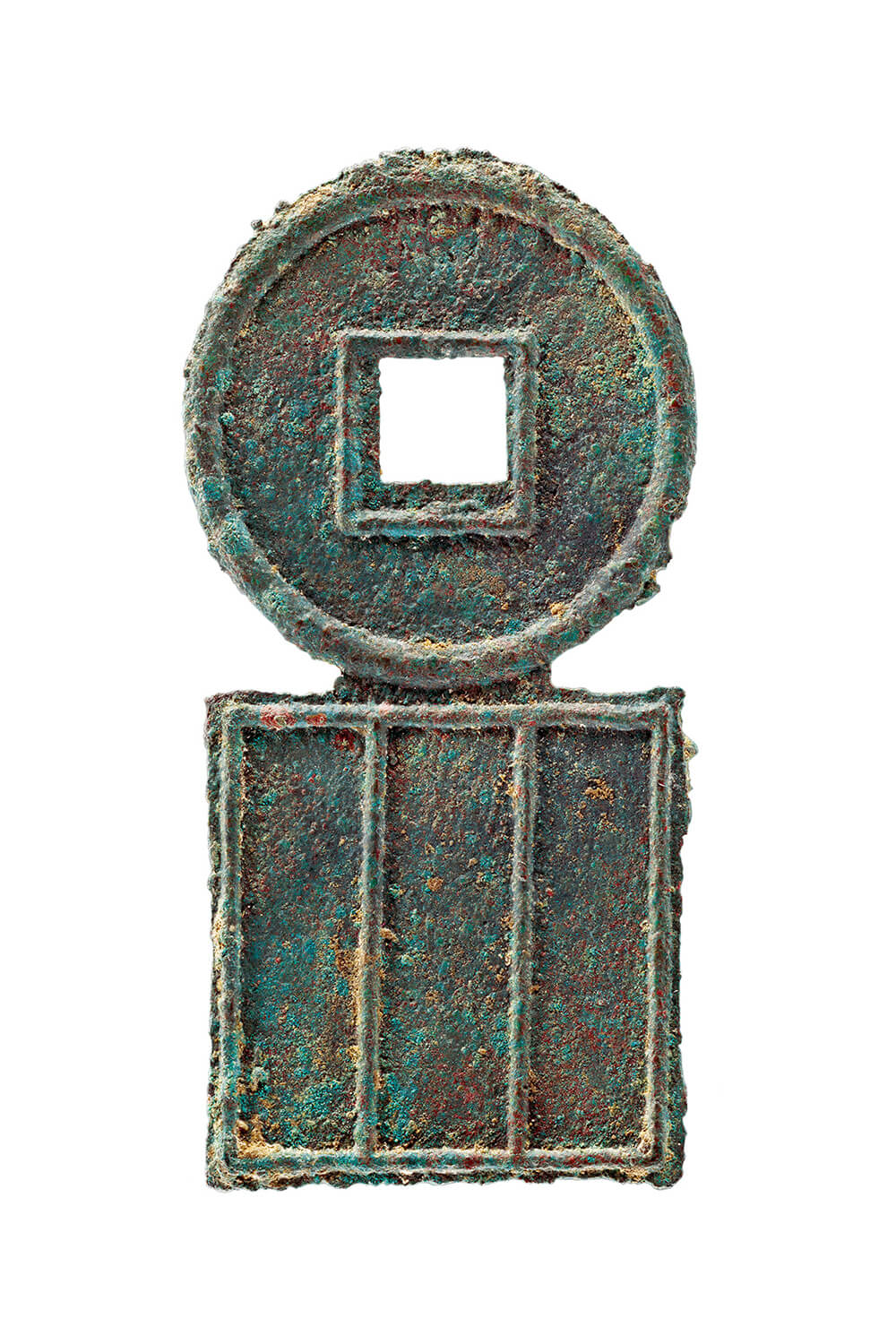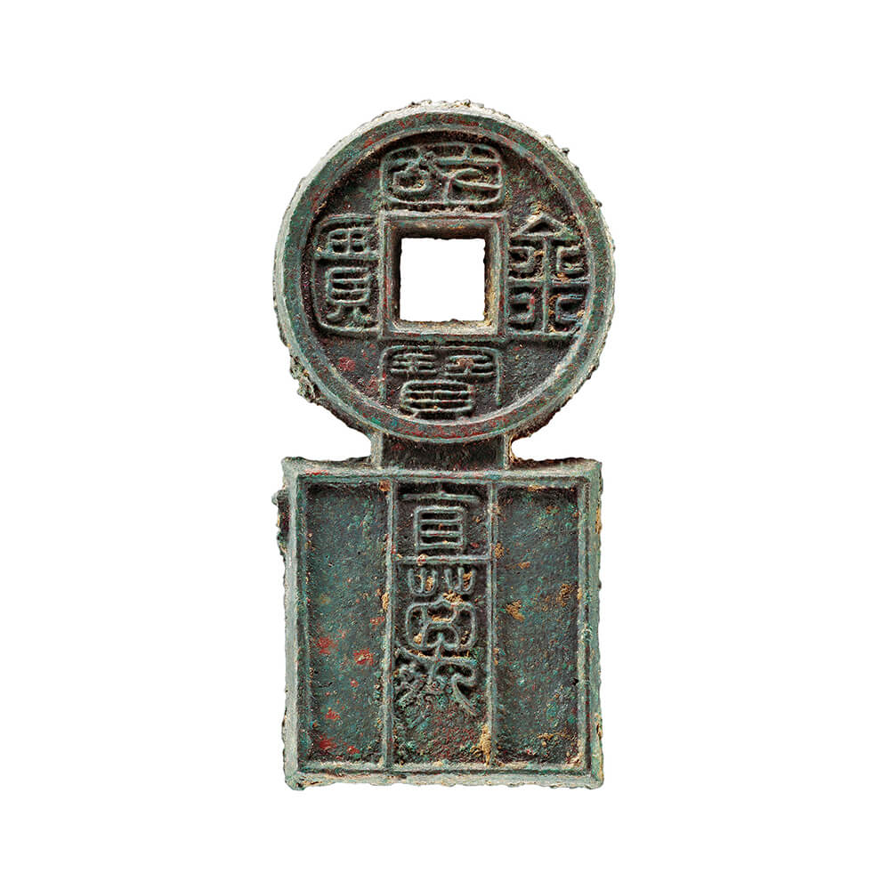 此钱上半部为方孔圆形,铸出“国宝金匮”四字,下半部为一正方体,铸出“直万”二字。钱缘流铜参差不齐,显然出型后尚未经过打磨加工,可能未正式流通,所以仅在今天的陕西西安汉城一带发现过数枚。