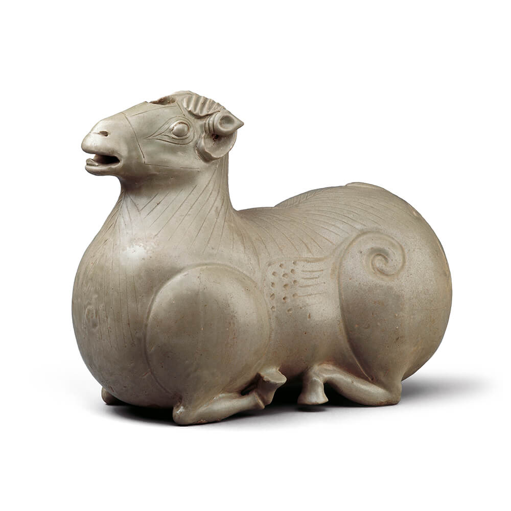 三国时期,青瓷器在产量、种类和质量上都比东汉时期有明显提高。当时青瓷器主要产地包括现在浙江宁波、绍兴、温州及金华等地区,其原料为一种含石英、高岭、绢云母类型的伟晶花岗石风化后的岩石矿,风化程度高,含有较多的高岭石矿物。这种瓷土含铁量较高,是烧造青瓷器的理想原料,与石灰石配制而成的石灰釉,光泽好,透明度高。这件烛台釉色匀净,充分显示出这一时期在烧造青瓷器的原料选择上的重大进步。而卧羊整体塑造简练,局部刻划精细,将羊的驯顺特性凸显无遗,反映了这一时期在烧造青瓷器的艺术化方面的追求。