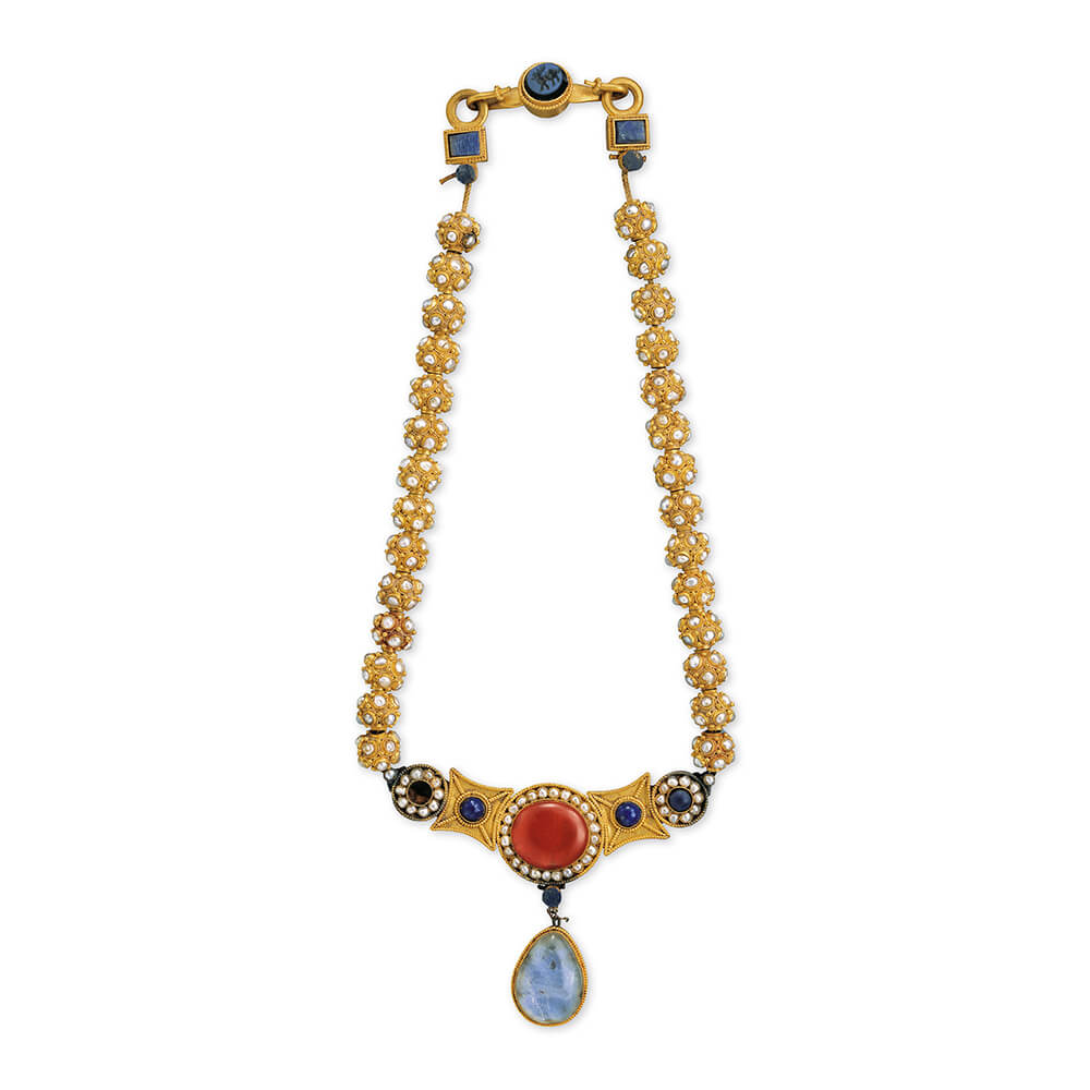 项链由28个金质球形链珠组成,每个球形链珠均由12个小金环焊接而成,其上又各嵌珍珠10颗,珠光闪闪,璀璨夺目。项链上端正中为圆形,内嵌凹刻一花角鹿的深蓝色垂珠。项链下端居中为一个大圆金饰,上镶嵌一块红色宝石,在红色宝石四周嵌有24颗珍珠,左右两侧各有一圆形金饰,上镶嵌蓝色珠饰,周缘亦各镶嵌珍珠一周。红色宝石下挂一心形金饰,上镶嵌一块长达3.1厘米,极为罕见的蓝色宝石。整条项链鲜红的红、蓝宝石交相辉映,再配以洁白的珍珠,在纯金的烘托下,显得格外鲜艳夺目,雍容华贵,堪称是举世无双的艺术精品。