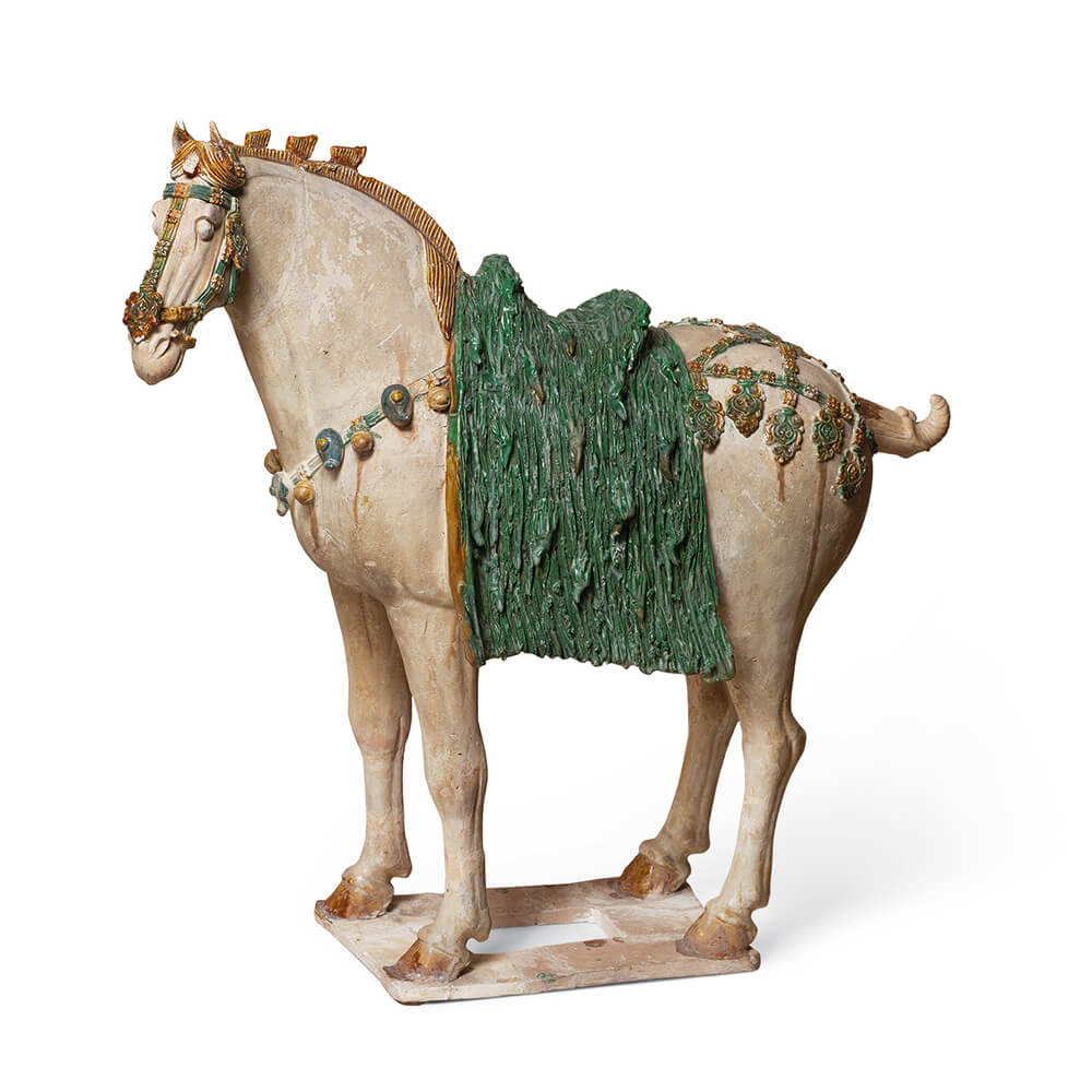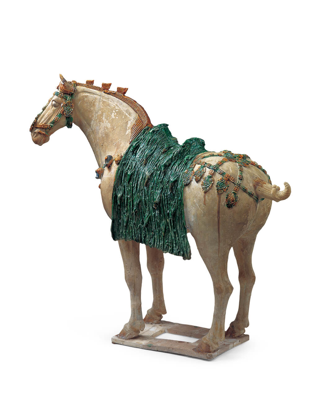 马头向左侧视,通身白色,鬃上剪三花,马鞍上披着深绿色绒毯状鞍袱,胸前和鞍后均络绿色革带。胸前的带上饰有黄色小铃(金铃),金铃间饰有黄点的蓝色流苏;鞍后皮带两侧各饰杏叶形垂饰5枚,革带交结尻上,交结处饰有杏叶形垂饰4枚。头上辔饰俱全,嘴角两侧带有角形镳,口衔勒,笼头上的装饰与胸股装饰相同,皮带饰黄色花朵。