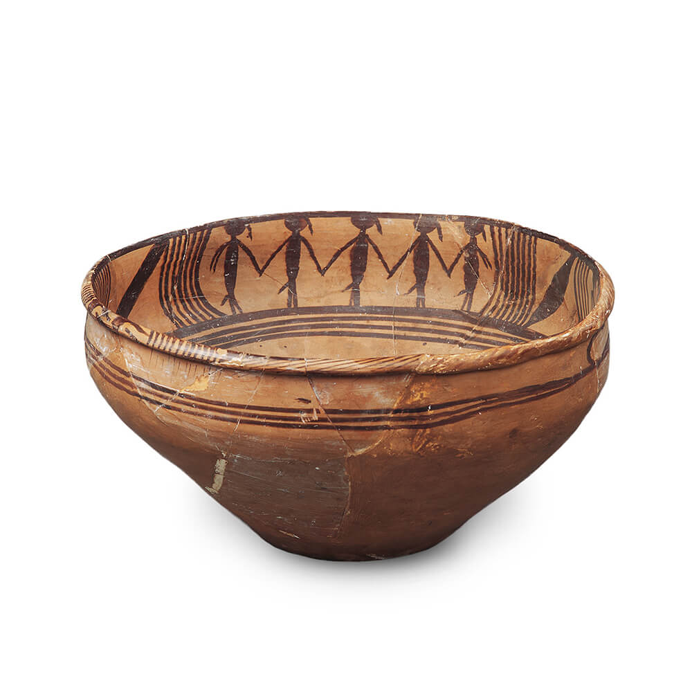 此彩陶盆呈橙红色。上腹部弧形,下腹内收成小平底。口沿及外壁以简单的黑线条作为装饰。内壁饰三组舞蹈图,图案上下均饰弦纹,组与组之间以平行竖线和叶纹作间隔。舞蹈图每组均为五人,舞者手拉着手,面均朝向右前方,步调一致,似踩着节拍在翩翩起舞。人物的头上都有发辫状饰物,身下也有飘动的斜向饰物,头饰与下部饰物分别向左右两边飘起,增添了舞蹈的动感。每一组中最外侧两人的外侧手臂均画出两根线条,好像是为了表现臂膀在不断频繁地摆动的样子。