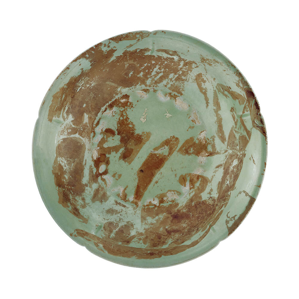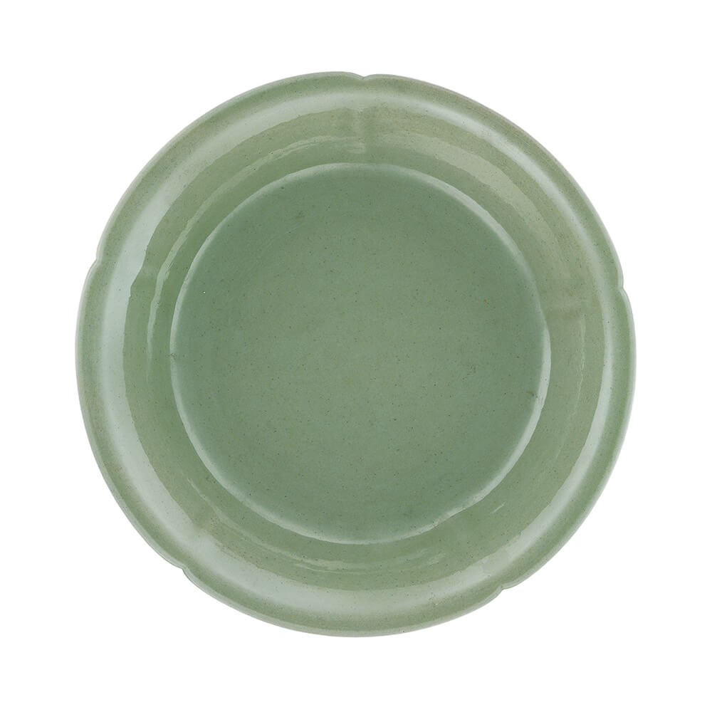 莲花尊釉呈青绿色,间有青中泛黄处。施釉均匀,胎釉结合牢固,没有脱釉现象,积釉较厚处有细小的冰裂纹。