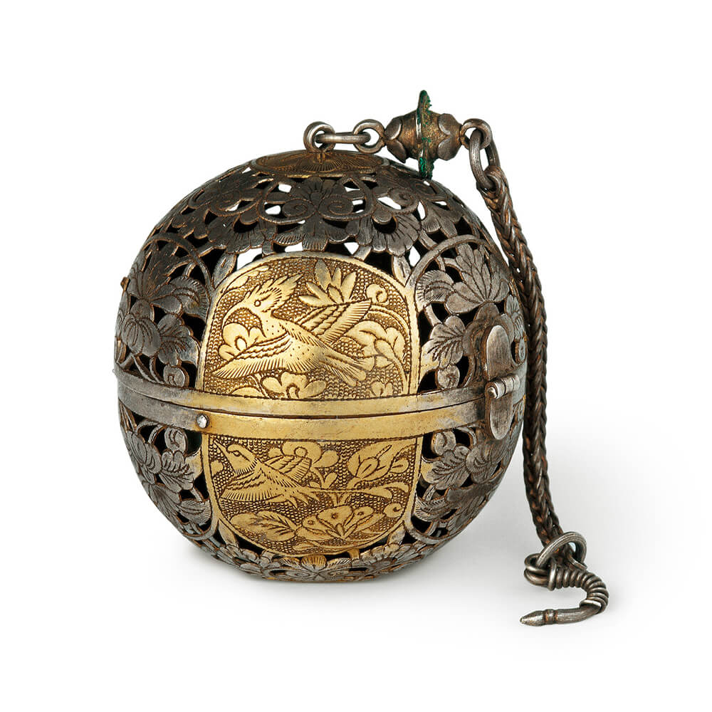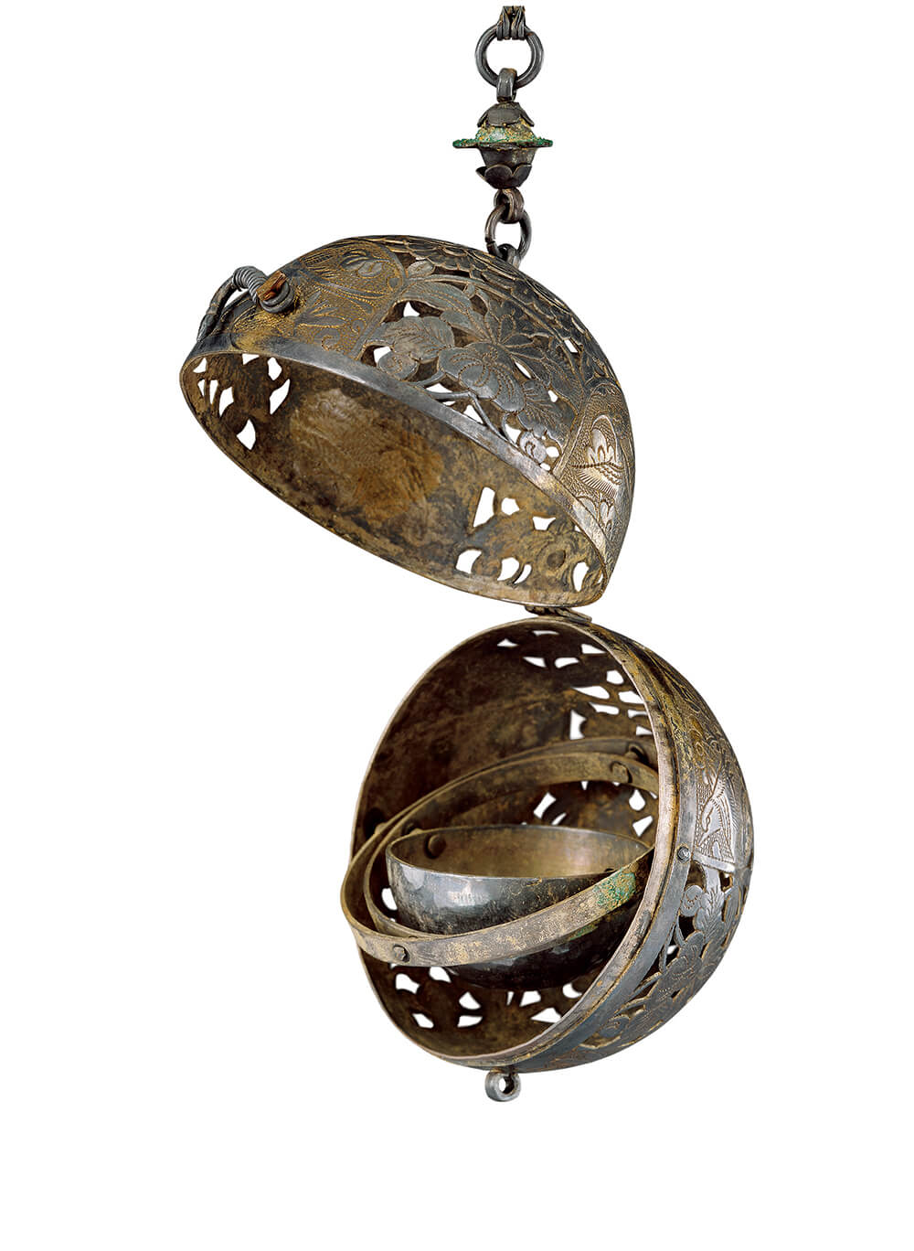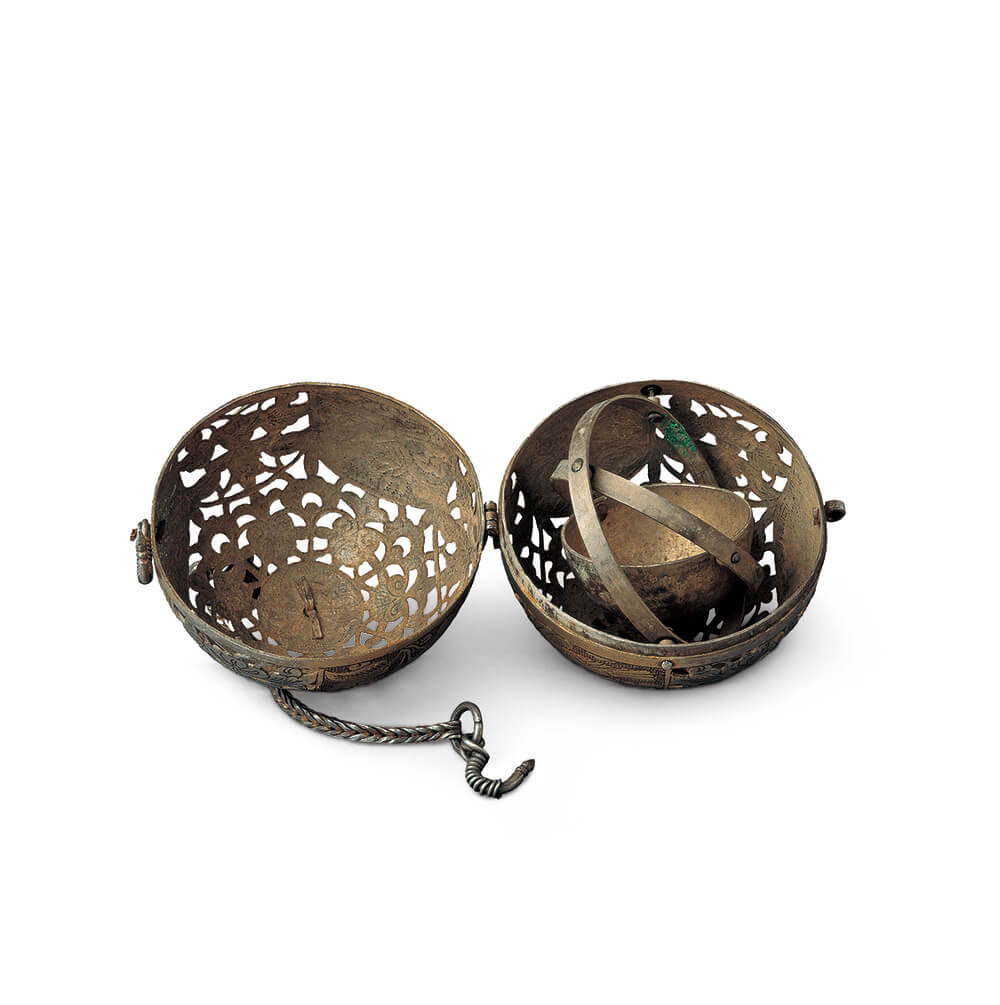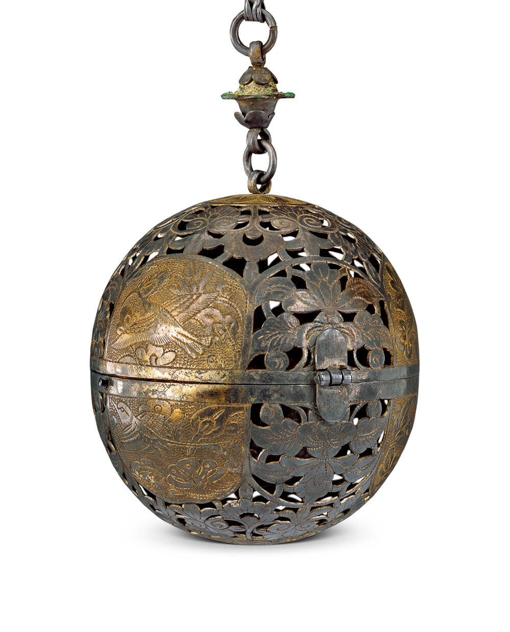 该香囊由两个半球组成,有子母口可以扣合。下半球内装有两个同心圆机环和一个盛放香料的香盂。大的机环与外层球壁连接,小机环分别与大机环和香盂相连。使用时,由于香盂本身的重力作用和两个同心圆机环的机械平衡,无论香囊如何滚动,里面的香盂都可以保持水平状态,香料不会倾撒。香囊外壳通体透雕花鸟纹饰,不仅美观,香气也通过这些镂空散发出来。香囊上有链条,上部有弯钩,这样既方便佩戴身上,也可以悬挂室内帐中。同出共4件,体形大小基本相同,应该是一个人或一个作坊制作的,年代至晚在8世纪中叶。