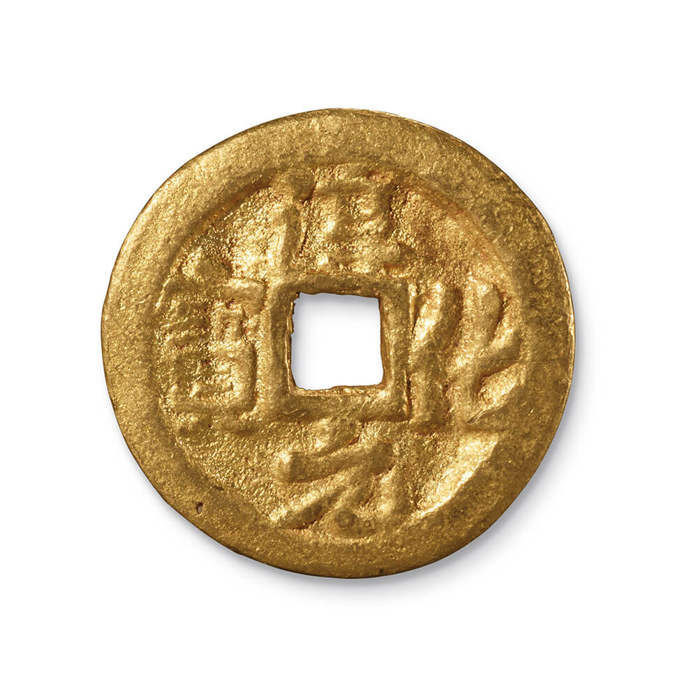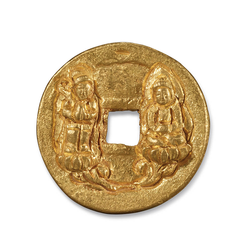 宋太宗时,皇室赐予五台山中顶寺的供养钱,此枚含金量96%。面文“淳化元宝”,背雕像,穿右为结跏趺坐于莲花座上的佛,左为双手合十站立在莲花瓣座上的韦陀(亦有善财童子等说),像铸造精巧,立体隆起0.2厘米。淳化元宝金钱秘埋于佛教圣地宝塔中,1988年为世人发现,总数近2000枚,钱正、背面形制基本一致,只有背面缘上数字不同,有“一”“二”“三”“四”和无錾刻五种形式。后流散于社会,其中1343枚由公安部门追回归国家文物部门,交由中国国家博物馆收藏,未追回者,部分流失海外。淳化元宝金钱的发现,为研究宋代政教关系、黄金铸币的性质用途等提供了重要实物资料。