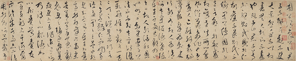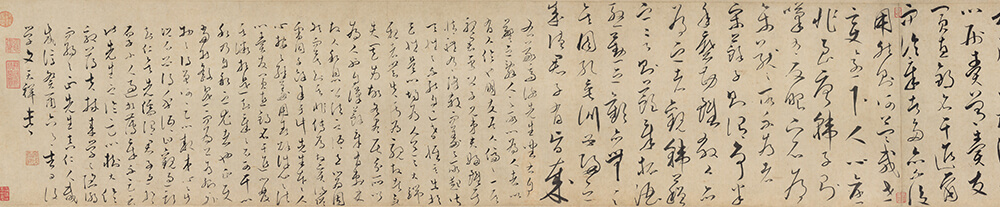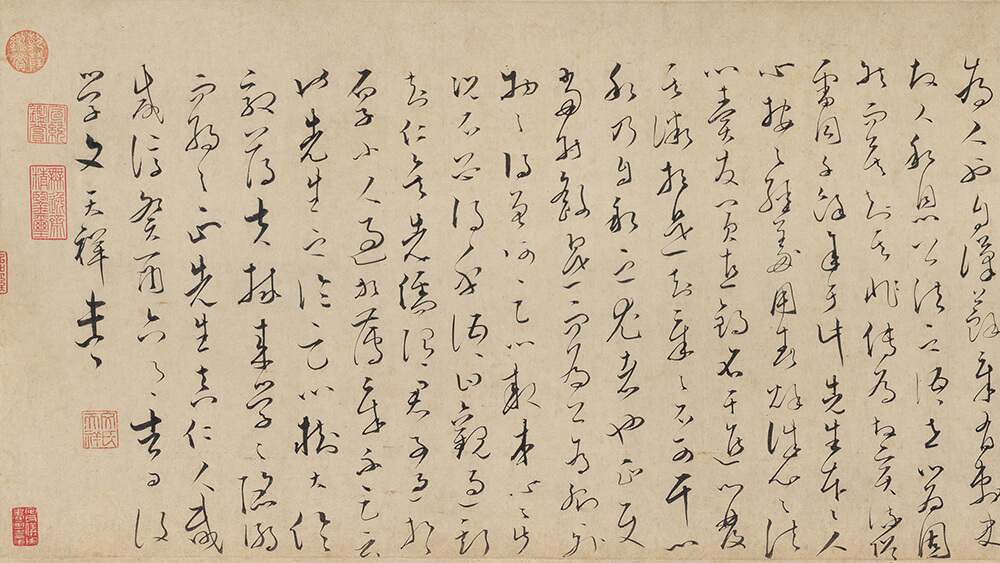 文天祥三十八岁时书,前段大字《座右辞》系友人谢昌元自警之文,后段是文氏跋语,作小字。卷后为宋元明人诸跋,有永乐二年(1404年)昌元五世孙谢源述其祖行状。文氏草书《木鸡集序》(辽宁省博物馆藏)与本卷写于同年,清劲挺竦风格一致,加之行书《宏斋帖》(1265年)(故宫博物院藏),其传世墨迹仅此三件。书以人传,是之谓也。