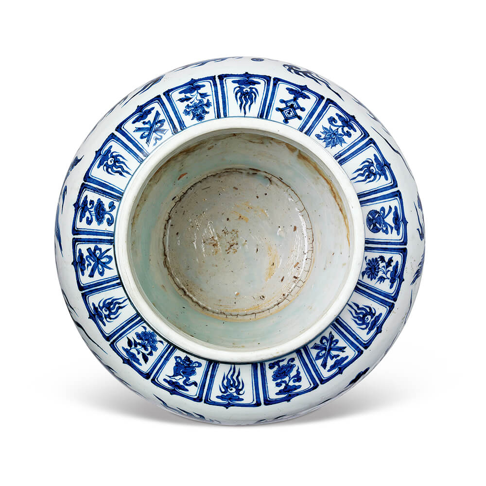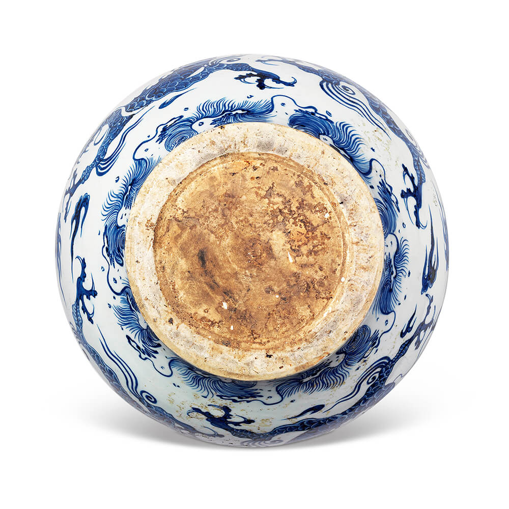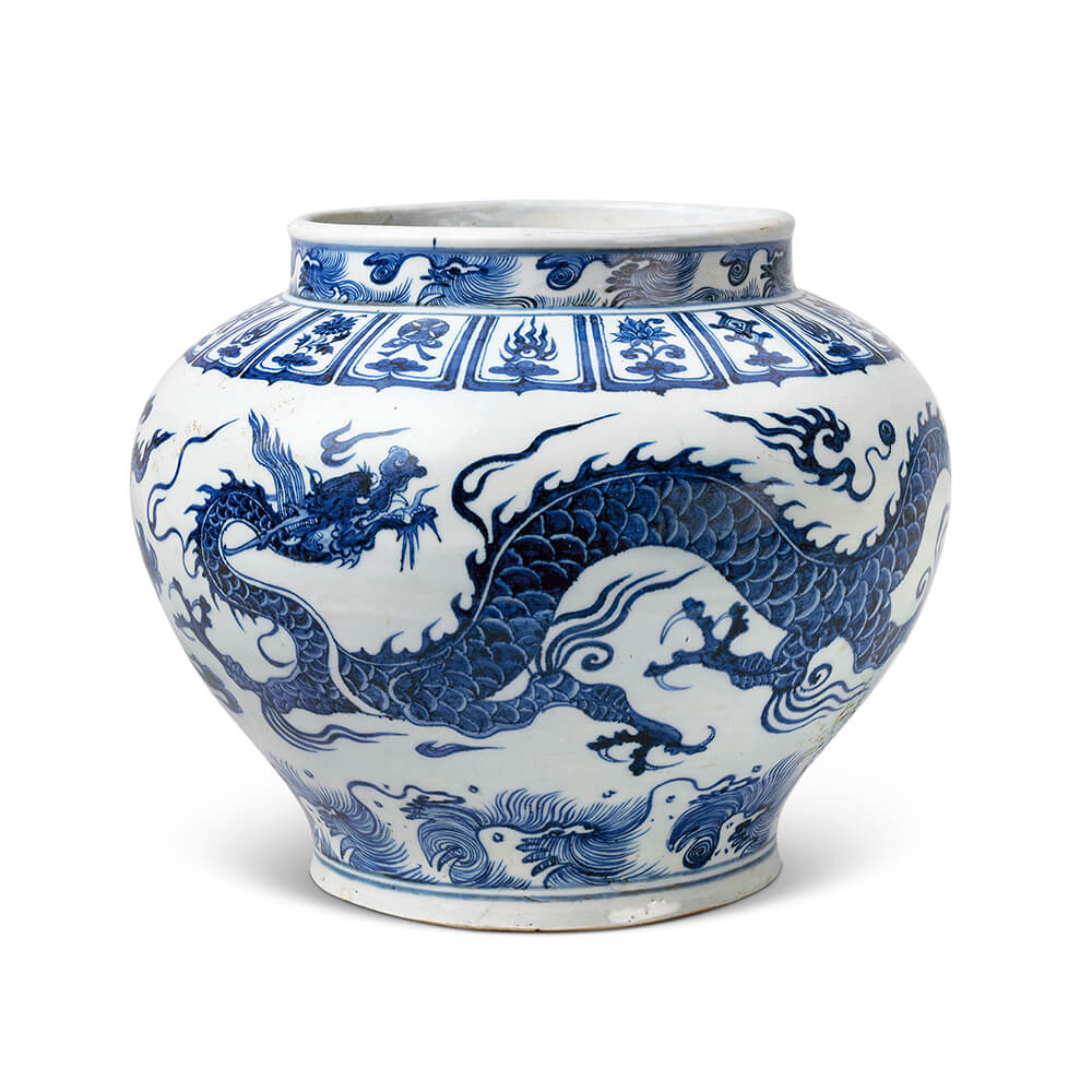 直口,短颈,丰肩,鼓腹,下腹向底束收,平底。青花苍翠浓艳,白釉微闪青,釉面薄透润泽,胎质洁白致密。腹部主体纹饰为云龙纹,龙呈腾奔飞扬状,张口露齿,头小颈细,躯体雄健,肢爪苍劲,肘毛随风飘扬,足有三爪,动感较强,周身辅以火焰状云纹,构成典型的元代龙纹式样。颈部和近足处绘海水纹,肩部饰莲瓣杂宝纹。造型墩厚饱满,纹饰繁密有致,青花鲜丽,凝聚而不晕散,实属景德镇窑元青花佳作。