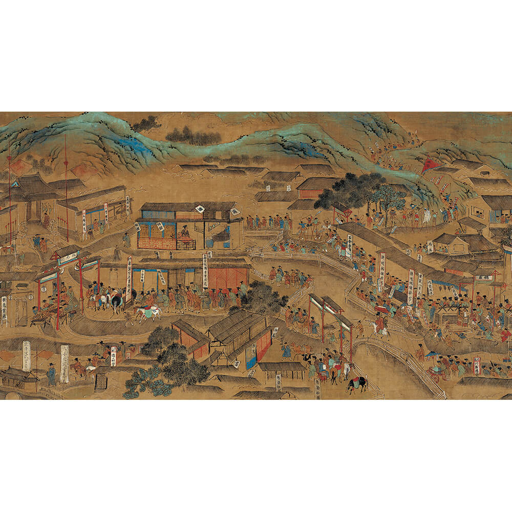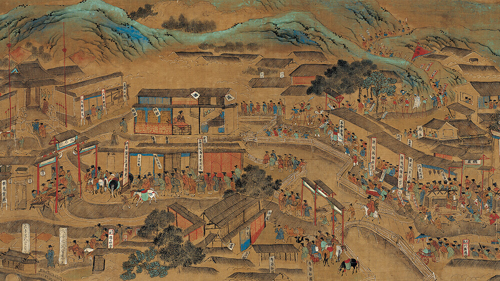 二是文艺活动的丰富。画卷中人物最为集中的地方是戏台前面。戏台搭在街道的中央,分前台和后台,前台上有一位艺人正在唱戏,后台有一位艺人正在化妆。男性观众站在街上,而女性观众则坐在上面遮有布幔的两座女台上看戏。街道周围的店铺酒楼也挤满了看客。画卷上还出现了踩高跷、武术表演等民间文艺活动,也吸引了大群的观众。