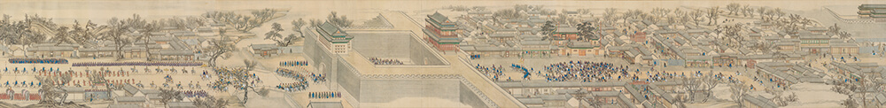这里展示的“前门街市图”是《乾隆南巡图》中第一卷“启跸京师”中的画面。该卷绘正月十三日乾隆帝奉皇太后钮祜禄氏自乾清门启銮后,出正阳门,右转沿西河沿大街西行,过宣武门,出广宁(安)门,经宛平县拱极城,至卢沟桥,再过长新(辛)店,前往良乡县黄新庄行宫的情景。卷首有梁国治书乾隆《恭奉皇太后南巡启跸京师近体言志》诗,下署“臣梁国治奉敕敬书”,后钤“臣”、“治”两方印。卷左下角款署:“南巡图第一卷。臣徐扬恭写。”下钤“臣徐扬”、“笔双春雨”二印。画卷钤有“乾隆御览之宝”、“乾隆鉴赏”、“石渠宝笈”等17方乾隆帝的印章。在这段画面上,店铺林立,招幌满目,人来人往,画家着意描绘了当时北京城商业的繁荣景象。