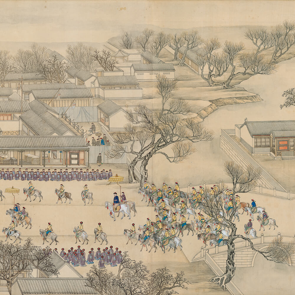 《乾隆南巡图》是描绘乾隆十六年(公元1751年)清高宗乾隆帝第一次南巡江浙的巨幅历史画卷。这次南巡历时112天,行程5800余里。图卷由宫廷画师徐扬奉命以“御制诗意为图”,共 12 卷。绘制内容分别是:启跸京师、过德州、渡黄河、阅视黄淮河工、金山放舟至焦山、驻跸姑苏、入浙江境到嘉兴烟雨楼、驻跸杭州、绍兴祭大禹庙、江宁阅兵、顺州集离舟登陆、回銮紫禁城。图卷以中国画传统的写实手法和艺术特色描绘了乾隆初下江南,省方问俗、察吏安民、视察河工、检阅师旅、祭祀禹陵和游览湖山名胜的情景,同时也描绘了锦绣江山和士农工商、官民人等的风情世态。
