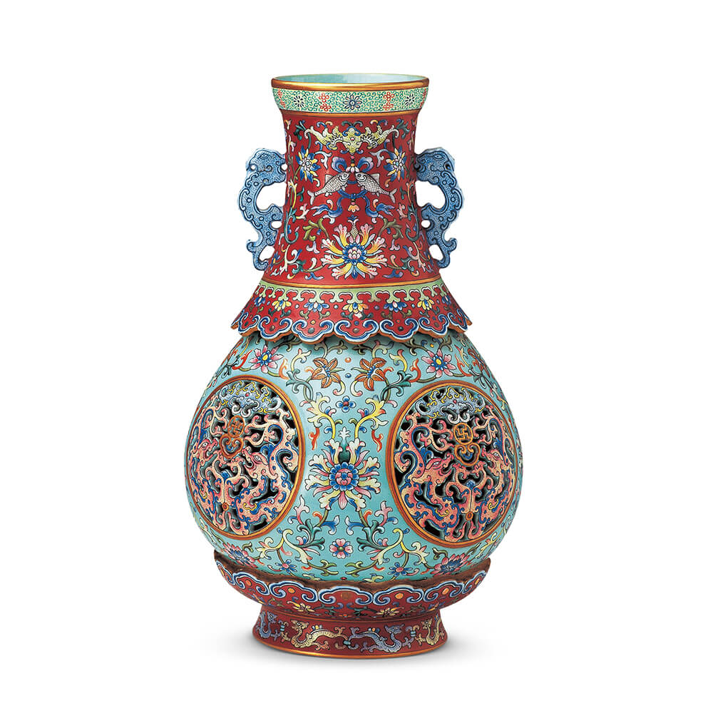 瓶体由外瓶、内瓶、底座分别烧造组成,外瓶套于内瓶外,内瓶与底座有轴碗相连,它是根据陶车旋转原理而制。通体色地饰粉彩,主体绘夔龙纹,辅以番莲纹、云纹等。外底松石绿釉上书红彩“大清乾隆年制”篆书款。清代景德镇瓷业于乾隆年间达到鼎峰,粉彩转心瓶为乾隆时期的佼佼者。该器外瓶精工镂雕,制作复杂,施彩浓艳,构图繁密,巧夺天工。