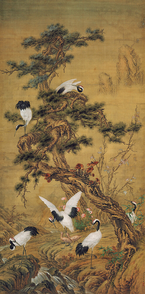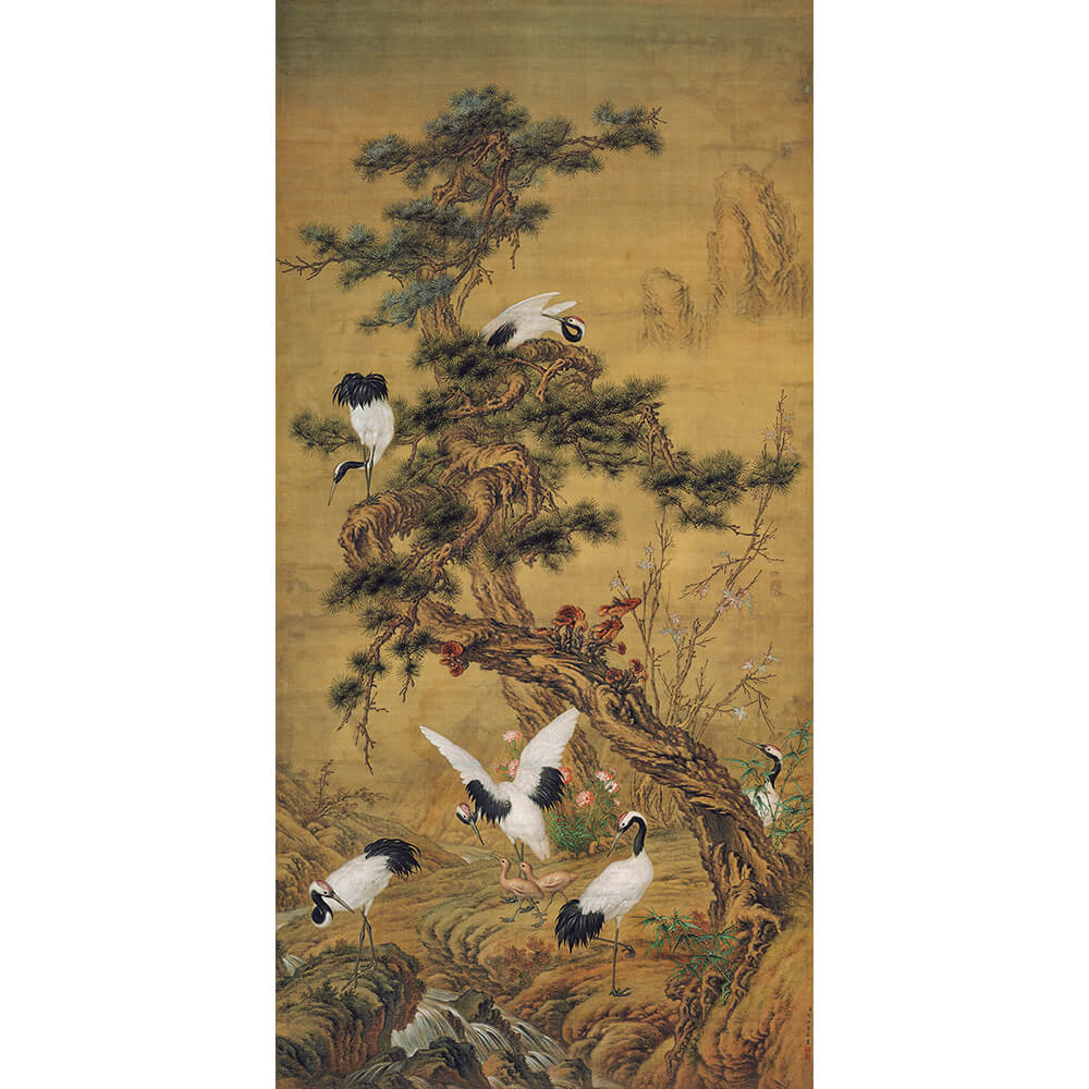意大利传教士画家郎世宁开启了中西合璧的画院新体。此图以海西法作中国传统祥瑞题材,画成年鹤六只,取“六合”谐音,所绘物象之光影效果尤为引人瞩目,推断作于雍正(1723—1735年)年间。郎氏画鹤作品仅存《松鹤图》轴(沈阳故宫博物院藏)《花阴双鹤图》轴(“台北故宫博物院”藏)与本作。