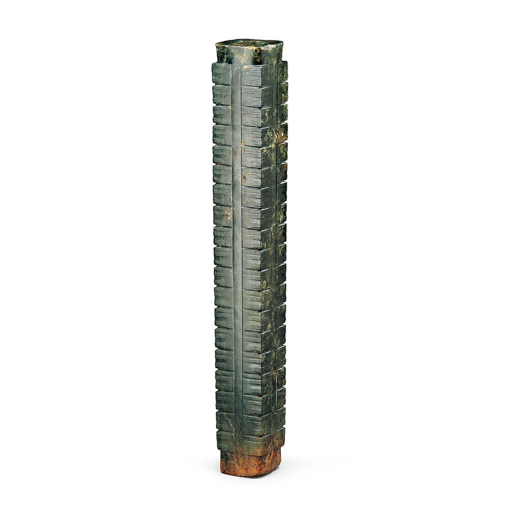 这件玉琮由墨玉制成,内圆外方,上大下小,中有穿孔,共19节,是目前国内所见最高的玉琮。玉琮四边的兽面纹已经高度符号化,近顶端阴刻有日月纹图案,器身局部残留有制作时的切割痕迹。