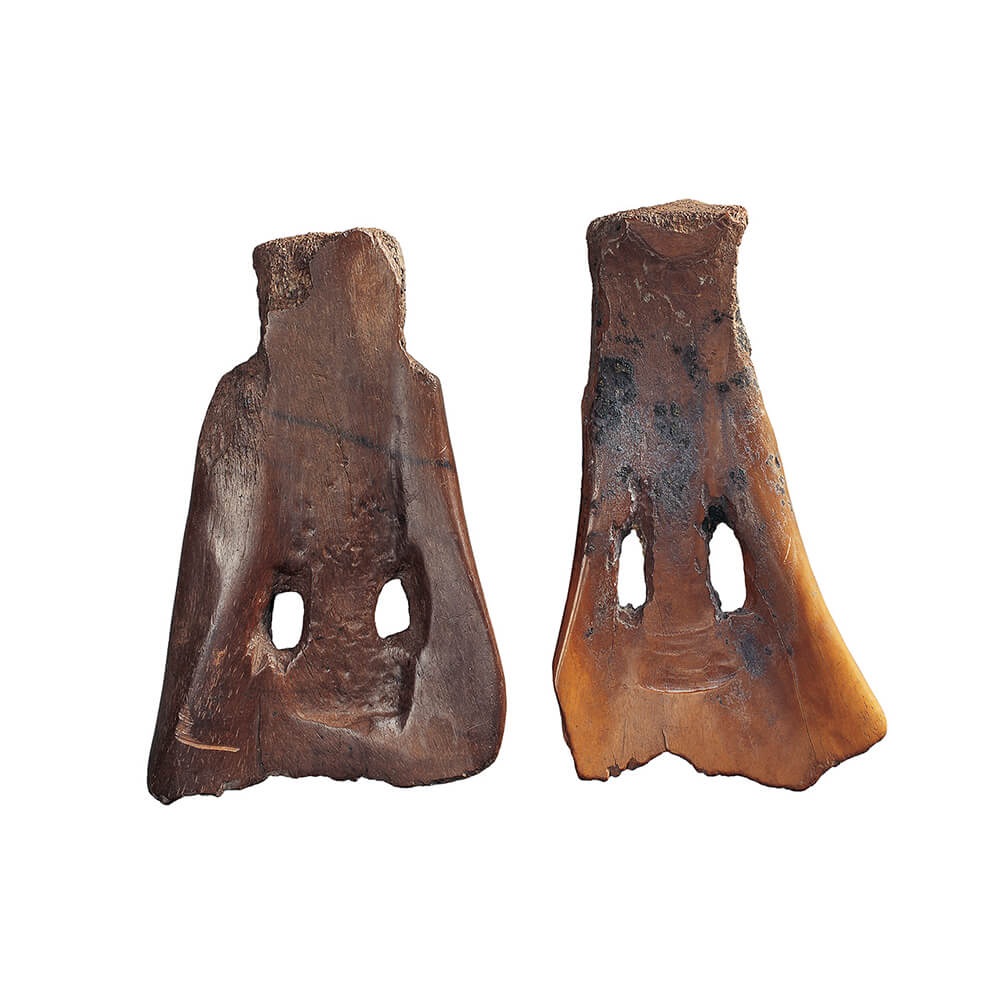 这两件骨耜由牛肩胛骨制成。肩胛骨的臼部锉削平整,骨板正中部凿一道纵向浅凹槽,凹槽下端左右各凿一孔,用来绑缚木柄。