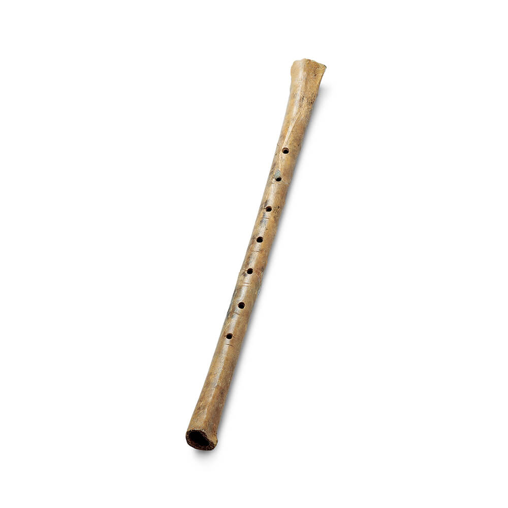 这支骨笛发现于裴李岗文化遗址内,同类笛子共有20多支,除了较多的七孔笛以外,还有5孔、6孔和8孔等多种形式。其中,最早的骨笛开有5-6个孔,只能奏出四声音阶和完备的五声音阶。中期的骨笛开有7孔,能奏出六声和七声音阶。晚期阶段的骨笛能奏出完整的七声音阶以及七声音阶以外的一些变化音。有的骨笛音孔旁还钻有调音的小孔、刻有等分符号等,显示出此时期的骨笛制作与演奏技法应该已经非常成熟。这些骨笛是中国最早的乐器实物,表明远在新石器时代中期的裴李岗文化时期,人们已经开始了音乐方面的早期实践并成功地制作了乐器。