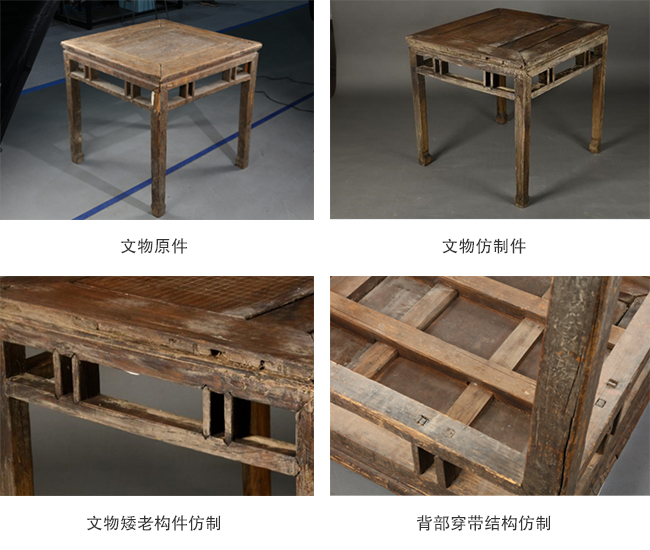 仿制过程分为开料、榫卯制作、做旧、做残、作色等工艺步骤。文物原件为我国传统木质方桌整体四方,上层台面为四攒框结构,中心版面为两拼版,使用过程中划刻围棋网格线条,背部加穿带支撑。桌面四周加横撑四条,横撑上部加矮老支撑柱八根。四腿为四方内翻马蹄足。在仿制过程中严格按照文物原始榫卯结构及相关使用痕迹制作。主体完成后根据文物原件残损状态作残做旧,对于文物划刻痕迹及开裂处,按照文物原始位置和长度雕刻制作。最后对文物进行作色处理。