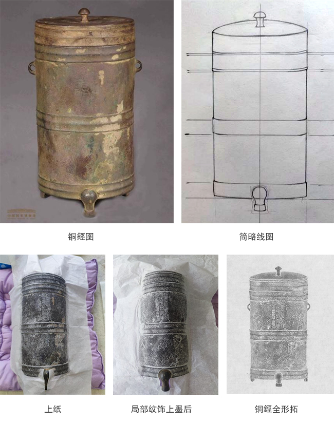 首先,试拓器物,绘制线图。将铜鋞的铭文和主要纹饰传拓下来,后根据器物文饰的拓片效果来进行器物线图的绘制。器物线图的绘制是全形拓呈现最直观、也是最具有主观性的一步。然后,上纸传拓。根据器物线图将器物主体文饰通过“整纸移拓”的全形拓技法,经上纸、上墨、揭起、移动纸张对齐文饰后再次上纸、上墨等步骤,将器物的大体形态呈现在宣纸上。最后,补全器物。将器物的盖、耳、足等部位拓于拓片上与器物中所对应的地方。再对器物细节进行“收拾”后,此件器物的全形拓就制作完成了。