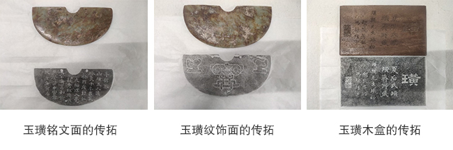 此次传拓木盒与铭文面均为常规传拓,难点在于玉璜的纹饰一面。正面的纹饰中除了中间与左右两边较大图案外,周身布满圆形底纹,且纹口较浅,也比较圆滑,所以很难清晰拓出。为了使纹饰更好地展现出来,本次传拓选择定制超薄的纸张。在排刷纸张时,选用毛质细密的刷子,稍用力且多次排刷,也可边排边打,这样可以使纸张与纹饰更好地嵌合。另外对扑子(拓包)也有特殊要求,由于软扑子较硬扑子更容易在传拓时污染到纹口内,此次专门制作了包裹较紧,质感较硬且最外层为较细密织物的扑子。最后在上墨时,传拓的力度要轻一些,手腕用力也要“弹”一些。这样尽可能使扑子只接触到纹口上方。尽可能清晰地传拓出玉璜的纹饰。