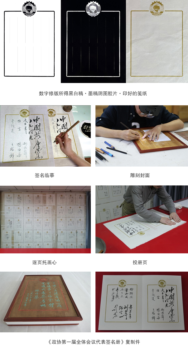《签名册》的原样复制是一个复杂的系统工程。首先选配与文物原件材质、厚度相近的纸张,文物影像经过精心修版,用石印机印出专用的笺纸。其次,选择合适的毛笔和墨块,在笺纸上将签名一一摹写,在此过程中要注意每个签名用墨的枯湿浓淡,如实还原。然后运用传统装裱技艺,将几十张零散的签名页装裱成册。最后合上手工雕刻的楠木封面封底。整个复制工作历经两个多月,遵循“原材料、原形制、原工艺工序”的文献复制原则,既有明确的分工,又有周密的合作,力求使复制品兼具文献价值与工艺价值。