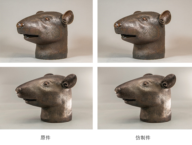 2023年,文保院在数据管理与分析中心的配合下,完成了两件兽首铜像的仿制工作。依托数据管理与分析中心开展的馆藏文物数字化信息采集,获得圆明园海晏堂鼠首、兔首铜像的高精度三维模型数据,在此基础上,通过3D打印获得两件兽首铜像的树脂模型。再结合文物复制中的传统翻模工艺,获得两件兽首铜像的模具;通过现代精密铸造工艺获得兽首铜像的铜胎,并对铜胎进行修整打磨,最后随色作旧。