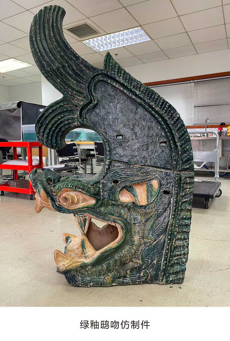 使用高精度三维扫描仪对绿釉鸱吻进行扫描,获取文物三维数据,在此基础上建立器物的三维模型,用树脂进行等比例3D打印,打印样件保证纹饰清晰、尺寸精准。根据打印的模型翻制模具,灌注树脂,打磨修饰后表面进行随色做旧,最终完成仿制品的制作。
